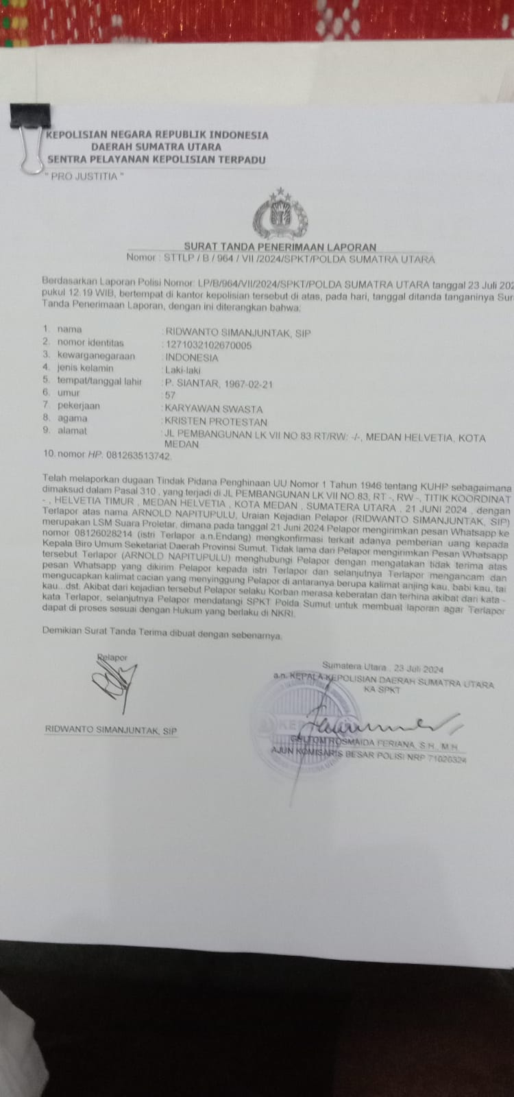 LSM PROLETAR resmi melaporkan mafia proyek di biro setda provsu inisial AN ke POLDASU