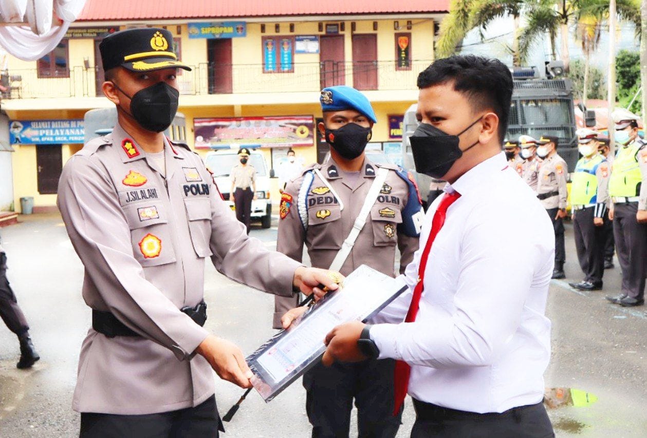 fajarinfo@online.com,”Tana Toraja — Kepala Kepolisian Resor Tana Toraja AKBP Juara Silalahi, S.IK, M.H, berikan Penghargaan kepada Briptu Frans Roy personil yang bertugas pada unit tindak pidana umum Sat Reskrim, di halaman Mapolres Tana Toraja, Senin (1/8/ 2022)
