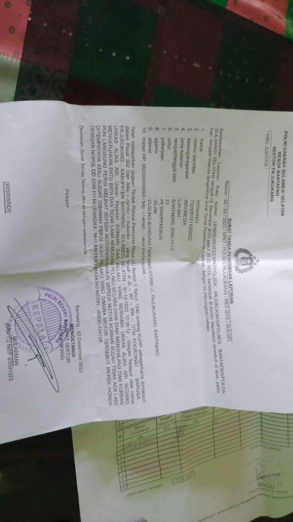 LP/B/50/XII/2023/Polsek Pa’jukukang/Polres Bantaeng/Polda Sulawesi-Selatan, Tanggal 2 Desember 2023 Pukul 08:02 Wita