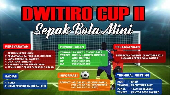 Pendaftaran tanggal 19 September sampai 03 Oktober 2022 tempat Dusun Jannaya Desa Dwitiro. Ayo daftar tim anda karena terbuka untuk umum. Hubungi kontak panitia KPRMD 0852-3640-0129.