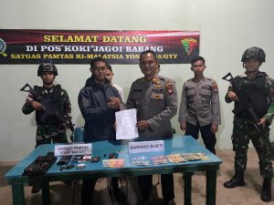 Dipimpin Wadan Satgas Kapten Inf Agus Dwi Prabowo Rabu, 03 Agustus 2022 pukul 01.20 Wib dilakukan penyerahan 2 (dua) orang tersangka beserta barang bukti dari Satgas Pamtas Yonif 645/Gty kepada Polsek Jagoi Babang.