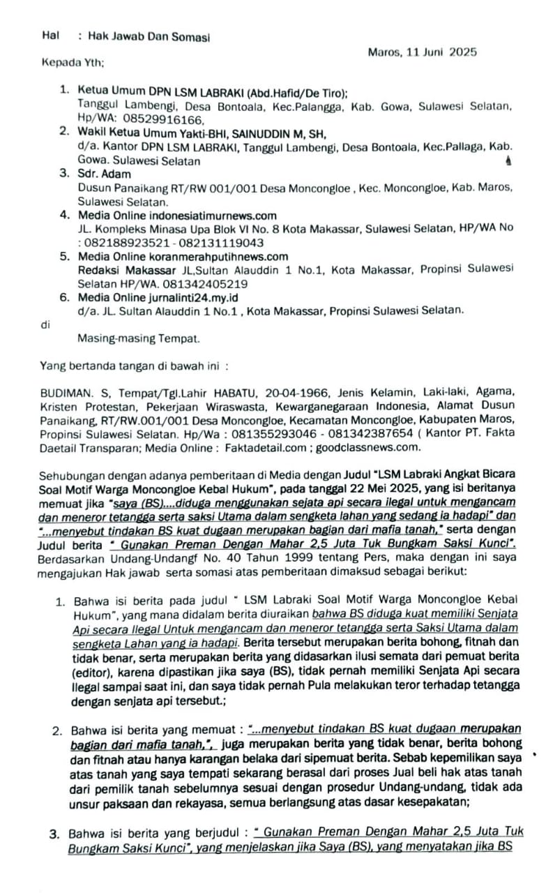 “Saya sudah menyampaikan hak jawab kepada media yang bersangkutan, namun hingga kini belum ada tanggapan. Hanya dua media, yaitu forummakassarinfo.com dan makassar.satu.suara.co.id, yang telah menyampaikan permohonan maaf dan menunjukkan itikad baiknya.