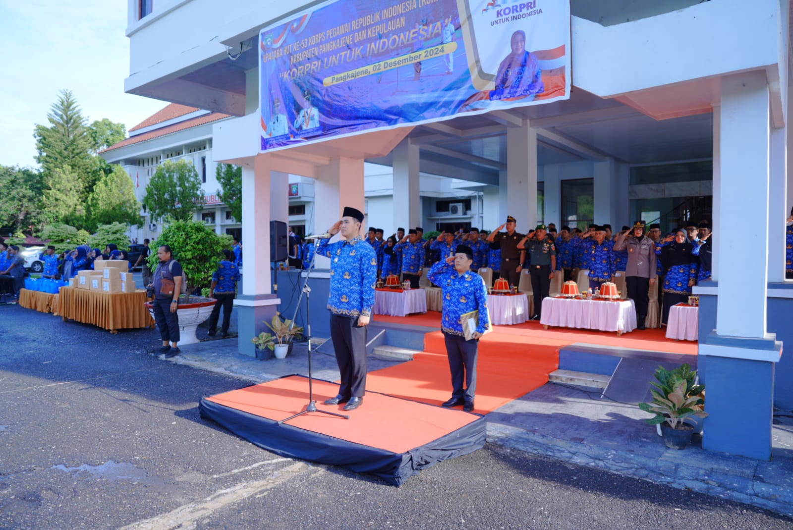 Ucapara peringatan HUT ke-53 KORPRI dihadiri ketua DPRD Pangkep, Forkopimda, diikuti kepala OPD dan ASN, di lapangan upacara kantor Setda Pangkep, Senin(2/12/24).