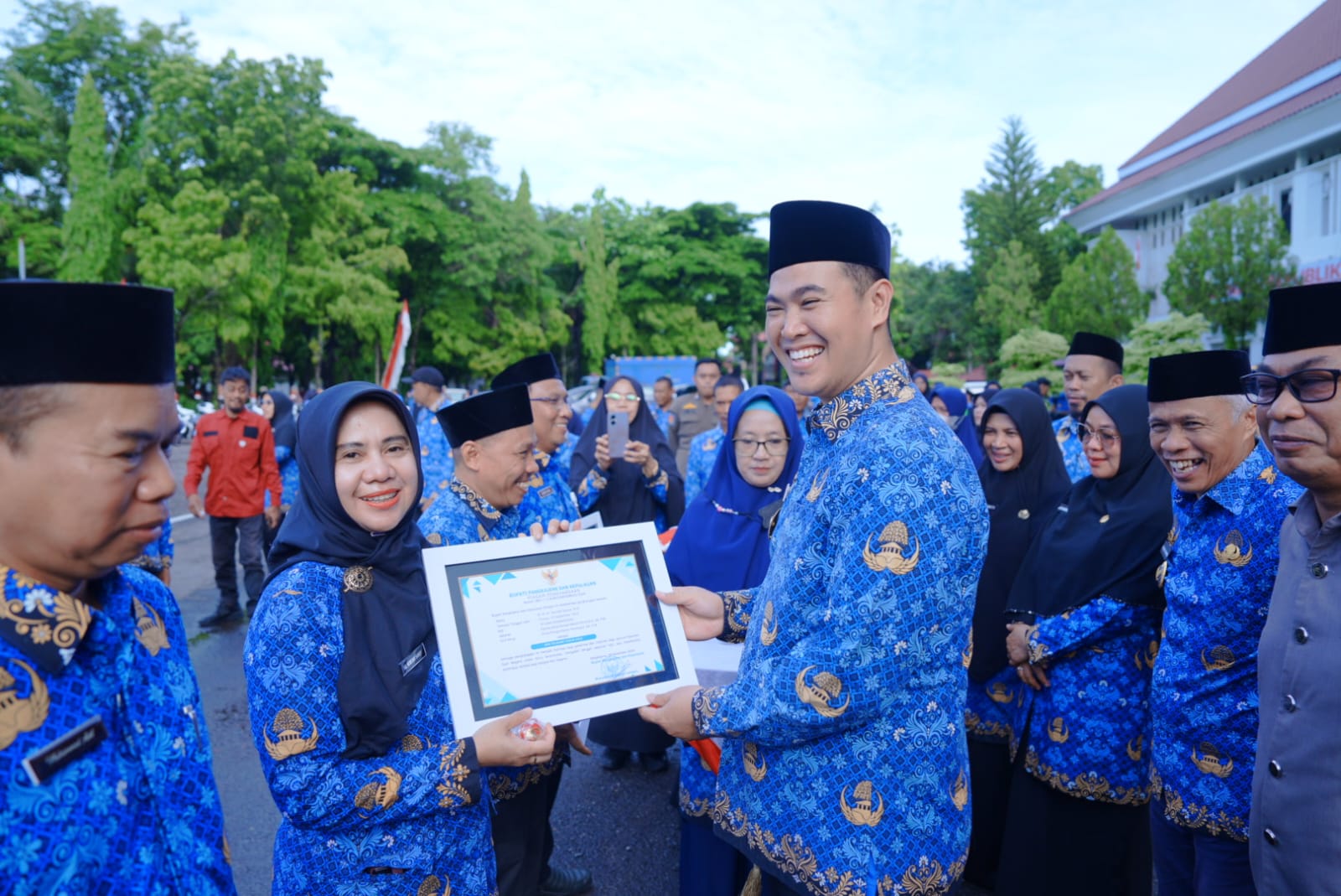 Usai upacara, bupati memberikan piagam penghargaan dan Pin emas kepada sejumlah ASN teladan, pejabat pimpinan tinggi pratama, administrator, pengawas, fungsional dan pengawas dan sertifikat kepada P3K.