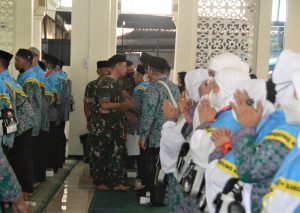 to Arief Wibowo yang diwakili oleh Kabintaljarahdam III/Siliwangi Kolonel Inf Budi Iman Santoso, S.E., memberangkatkan 56 calon jemaah haji Kodam III/Siliwangi tahun 1443 H/2022 M yang tergabung dalam Kelompok Bimbingan Ibadah Haji dan Umroh (KBIHU) Kodam III/Siliwangi di Masjid Al-Ikhlas Makodam III/Siliwangi Jalan Aceh No. 69, Kota Bandung, Jabar, Jum’at (17/06/2022).