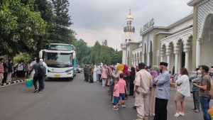Dengan menggunakan bus, para calon Jemaah haji bergerak menuju Embarkasi Jakarta sambil mengumandangkan talbiyah Labbaika allahumma labbaik, Labbaika laa syariika laka labbaik, Innal hamda wanni’mata laka wal mulk laa syariikalaka. (Pendam III/Siliwangi).