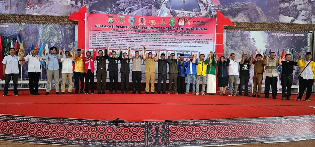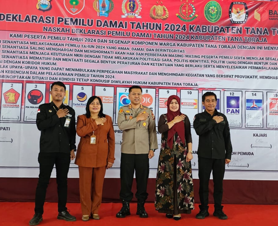 Penandatanganan deklarasi sebagai bentuk kesepakatan dalam menciptakan pemilu damai tahun 2024 “Hari ini kami menggelar deklarasi pemilu damai tahun 2024 dengan harapan pelaksanaan pemilu kedepan dapat berjalan aman dan kondusif khususnya di wilayah Kabupaten Tana Toraja” Sambut Kapolres Tana Toraja