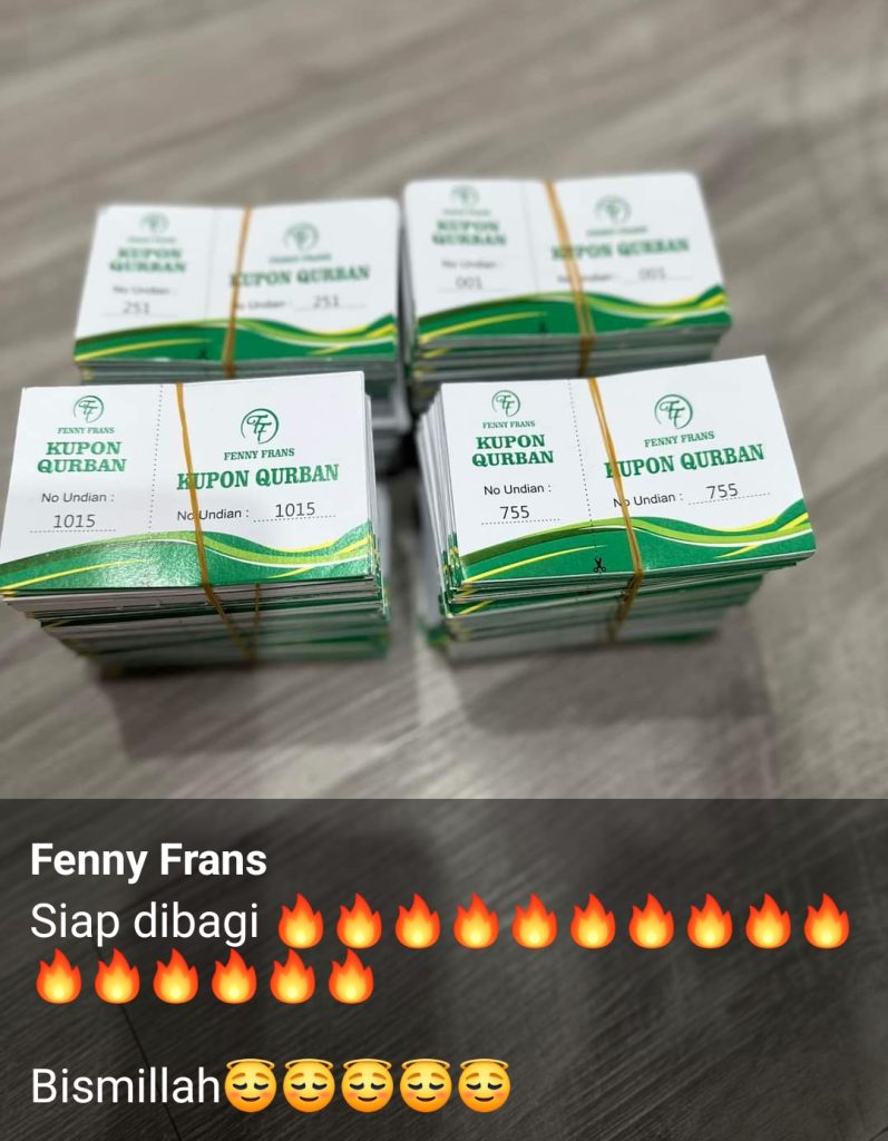 Sekitar Kurang lebih 1500 kupon qurban telah disiapkan oleh Atox Sila Fenny Frans owner FF cosmetic yang akan dibagikan kepada kaum dhuafa dan fakir miskin juga keluarga,kerabat serta anggota Team FF cosmetic.
