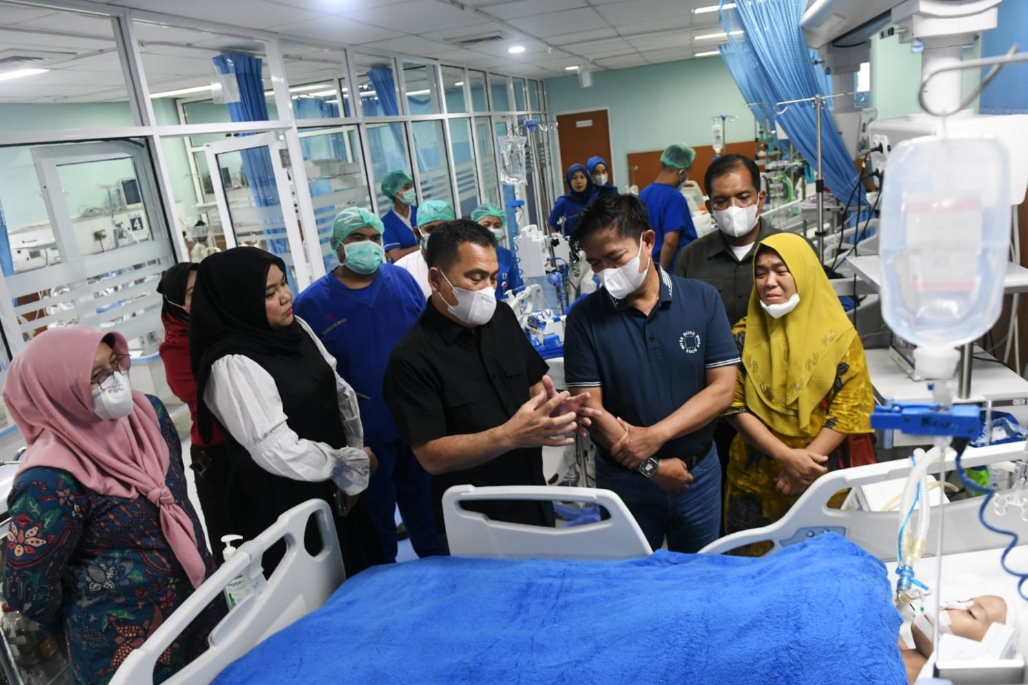 Bersama Kepala Dinas Kesehatan Sumut Alwi Mujahit Hasibuan, Direktur Rumah Sakit Haji Rehulina Ginting, Kepala Biro Umum Dedi Jaminsyah Putra Harahap, dan Kepala Biro Adpim Moettaqien Hasrimi, Pj Gubernur Sumut melihat kondisi Sakira Nayla Lubis yang masih terbaring koma di Ruang Pediatric Intensive Care Unit (PICU).