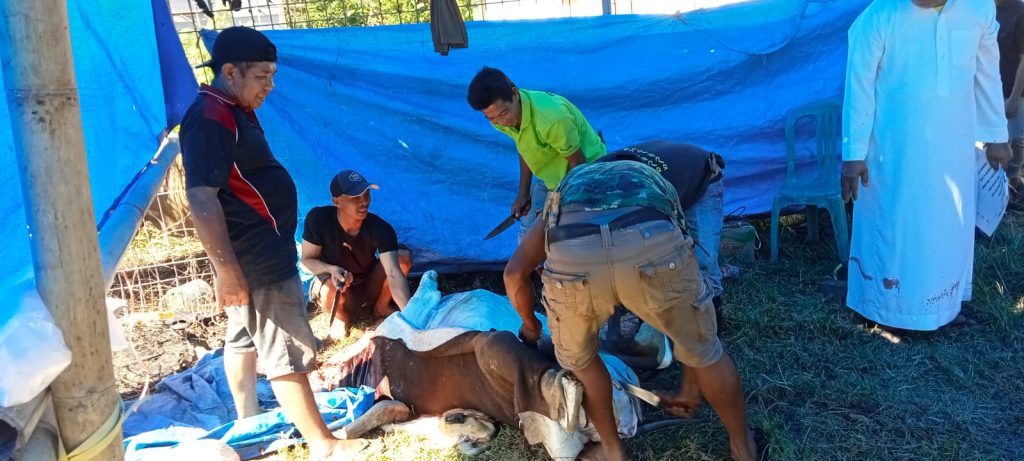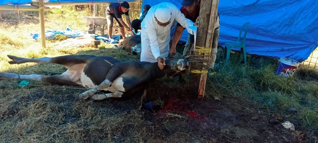 Disamping itu pelaksanaan pemotongan hewan Qurban melibatkan warga masyarakat yang di koordinir oleh panitia pemotongan hewan qurban , dan pelaksanaan pemotongan Hewan Qurban dilakukan oleh Ketua Umum H. Abd. Gaffar. Setelah hewan qurban di potong kemudian di bagikan kepada seluruh warga masyarakat yang ber penduduk tetap maupun yang berpenduduk sementara serta para jompo/lansia yang ada di Wilayah Dusun Bugis dan sekitarnya, masing – masing warga mendapat 1,kg daging dan di bagi habis oleh panitia.