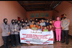 Dipimpin langsung oleh Bapak Kapolres Takalar AKBP Gotam Hidayat, S.I.K.,M.Si dan didampingi Ibu Ketua Kemala Bhayangkari Cabang Takalar Ny. Dewi Gotam Hidayat, Personil polwan yang diketuai oleh Aipda Sri Ahyani Qur’an melaksanakan kegiatan Baksos melalui penyerahan paket sembako di dua Panti Asuhan yakni Panti Asuhan Ar-Rahmah yang berada di Kecamatan Pattallassang, dan Panti Asuhan Mega Mulia yang berada di Kecamatan Polut.