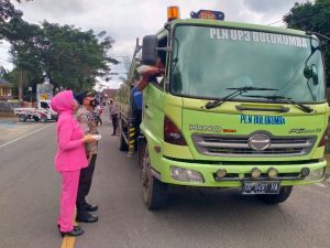 Kapolsek Bulukumpa selaku pembina Bhayangkari Bulukumpa Iptu Abdul Rahman Mubin, S.Pd bersama personel turut hadir membantu membagikan dan melaksanakan pengaturan arus di jalan.
