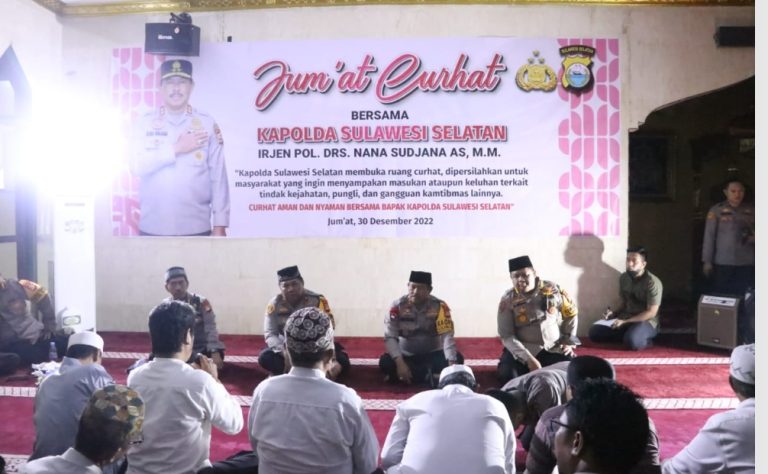 Fajarinfoonline.com,”Kapolda Sulsel, Irjen Pol Nana Sudjana menampung berbagai aspirasi masyarakat melalui program Jumat Curhat yang diadakan di Mesjid Syuhada 45 Mapolda Sulsel , Jumat (30/12/2022).