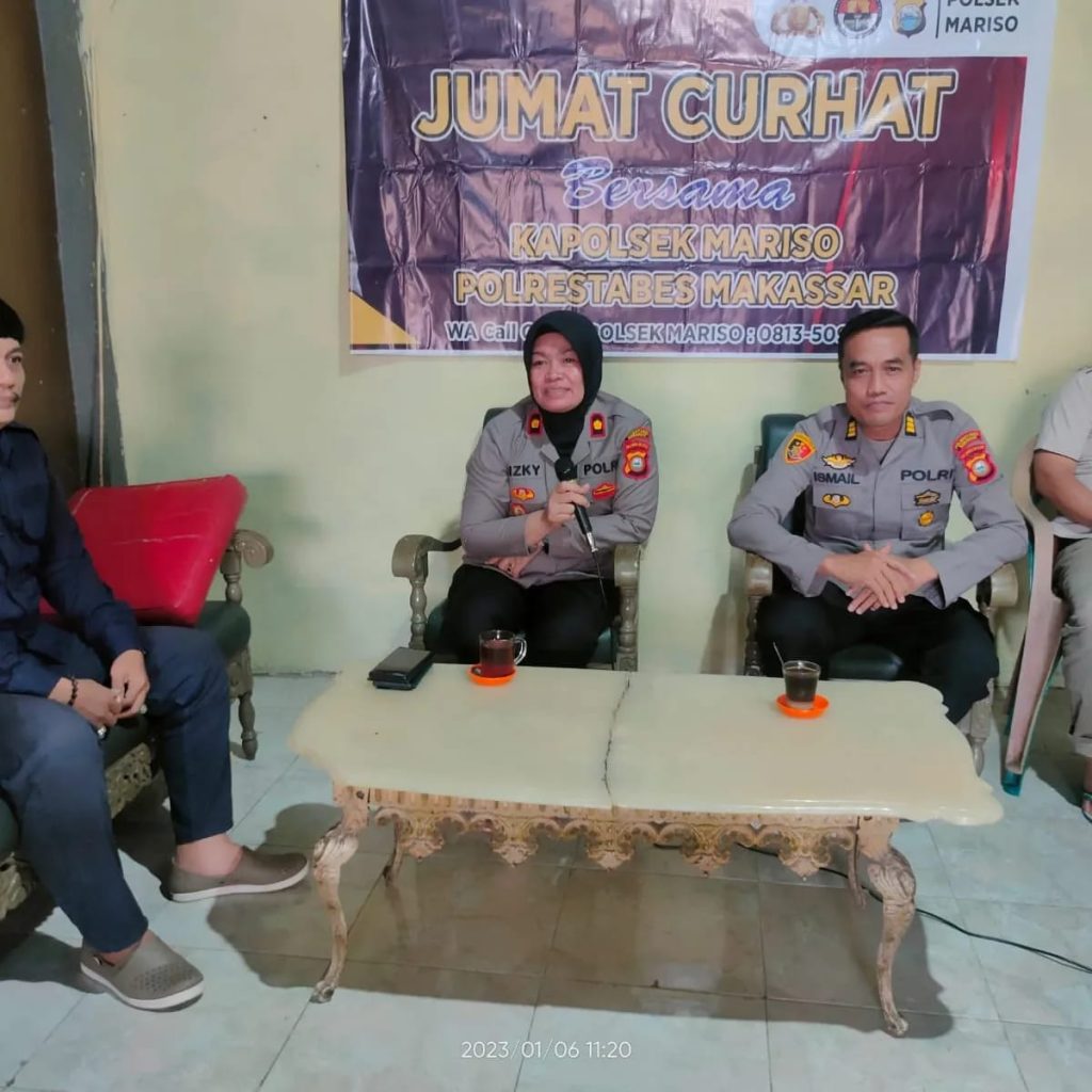Untuk yang Ketiga kalinya Kapolsek Mariso Polrestabes Makassar Kompol Rizkiana, SH., MH. bersama PJU Polsek Mariso, Tokoh Masyarakat, Tokoh Agama serta Warga Mariso menggelar Jumat Curhat, Jumat ini bertempat di Warkop Matahari Jln. Matahari Kel. Mattoanging Kec. Mariso Makassar.