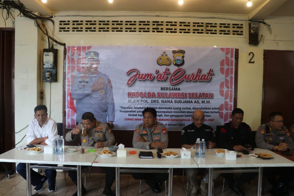 Fajarinfoonline.com,” Wakapolda Sulsel Brigjen Pol.CH.Patoppoi  mengadakan kegiatan bertajuk “Jumat Curhat” untuk mendengarkan keluhan masyarakat, Jumat (5/01/2023). Wakapolda Sulsel bersama Irwasda dan PJU Polda Sulsel ngobrol santai bersama warga di Ben’s Coffe di Jl Kajolalido Makassar.