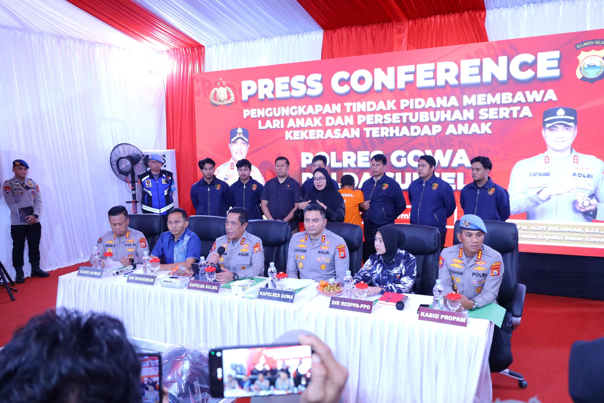 Kapolda Sulawesi Selatan Irjen Pol. Djuhandhani Rahardjo Puro, S.H., M.H., memimpin Press Conference pengungkapan tindak pidana membawa lari anak, persetubuhan dan/atau perbuatan cabul terhadap anak, serta kekerasan di Mapolres Gowa, Selasa (09/12/2025).