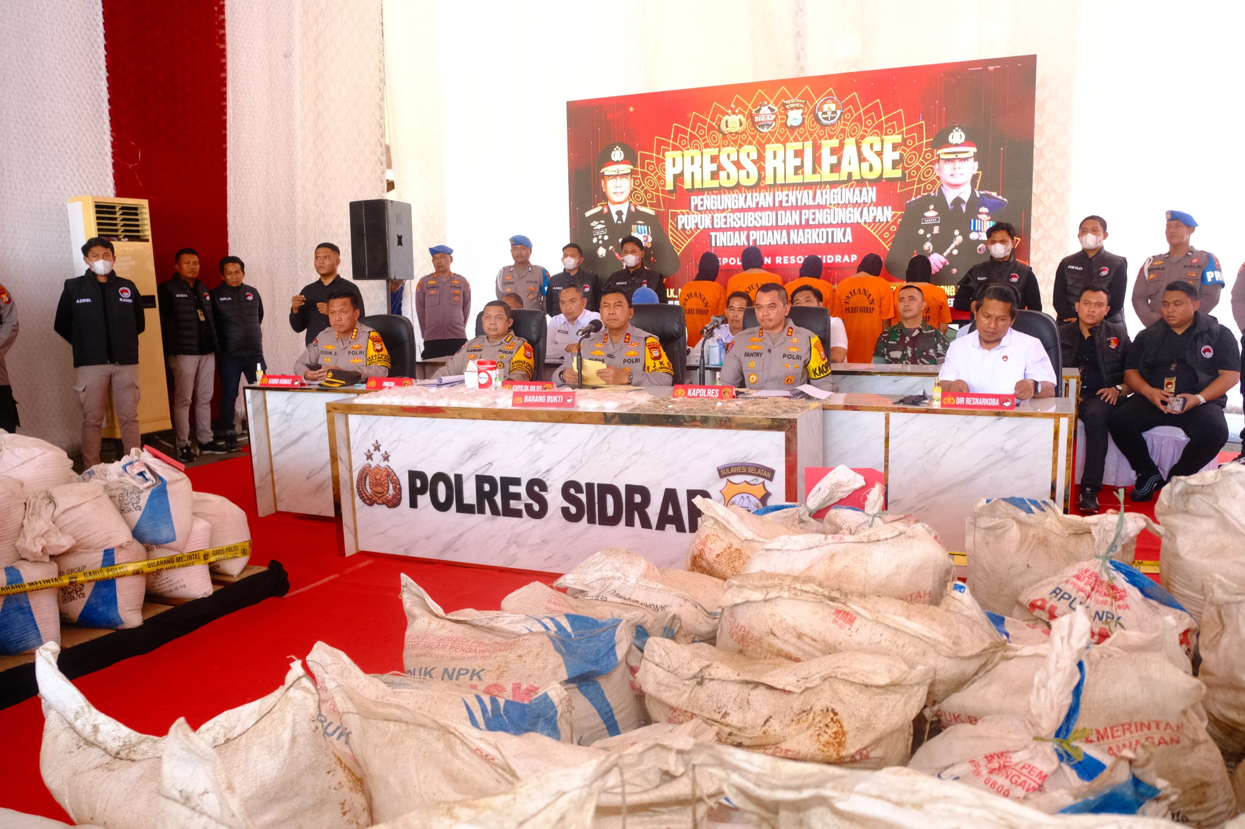 Fajarinfoonline.com,”Kapolda Sulawesi Selatan, Irjen Pol. Yudhiawan S.H., S.I.K., M.H., M.Si., memimpin langsung Konferensi Pers terkait pengungkapan kasus tindak pidana Narkoba dan penyalahgunaan Pupuk Bersubsidi di Mako Polres Sidrap pada Rabu (19/02/25). Acara ini juga dilanjutkan dengan pemusnahan barang bukti hasil pengungkapan kasus tersebut.