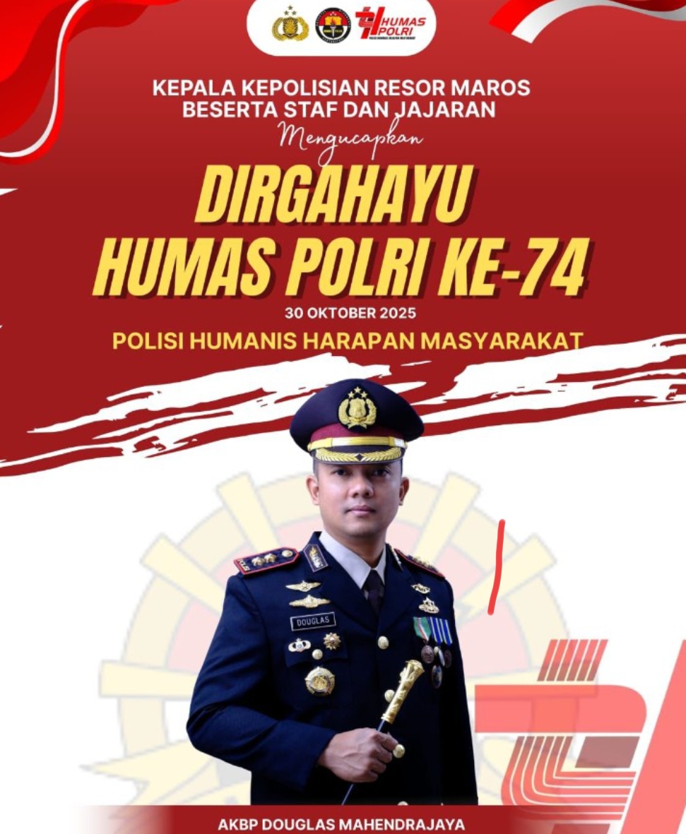 “Selamat Hari Lahir Humas Polri ke-74. Semoga Humas Polri, khususnya Humas Polres Maros, terus menjadi garda terdepan dalam menyebarkan informasi yang benar dan membangun kepercayaan publik,” ujar AKBP Douglas Mahendrajaya.