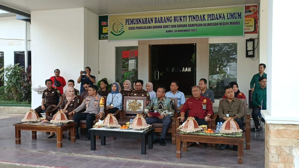 Fajarinfoonline.com,” Kejaksaan Negeri Maros menggelar agenda kegiatan pemusnahan Barang Bukti perkara pidana umum yang sudah putus dan berkekuatan hukum tetap (inchraht) yang dipimpin langsung Kepala Kejaksaan Negeri Maros Wahyudi Eko Husodo, S.H., M.H. dan dihadiri oleh Ketua DPRD Maros (H.A. Patarai Amir, SE.), Kapolres Maros (AKBP Awaludin Amin, S.IK), perwakilan dari PN Maros dan Kasat Reskrim Polres Maros (IPTU Slamet, R, SH. MH.) beserta seluruh Jaksa pada Kejaksaan Negeri Maros. Pada Kamis pagi (30/11/2023)