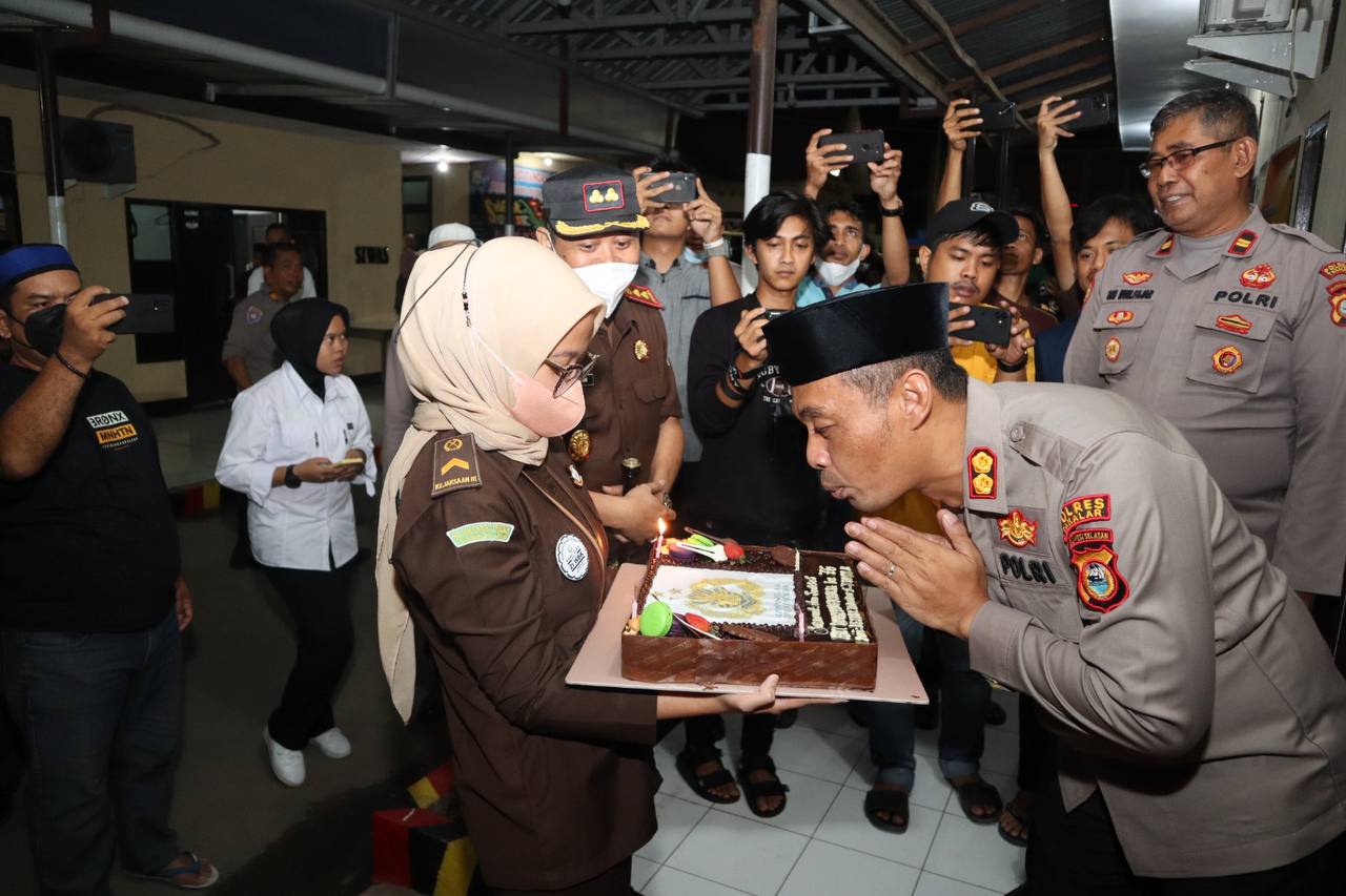Sebuah kue tart berlogo Tribrata dengan lilin angka 76 diserahkan langsung oleh Kajari Takalar Salahuddin, SH.MH kepada bapak Kapolres Takalar AKBP Gotam Hidayat, yang disambut dengan tiupan lilin oleh bapak Kapolres.