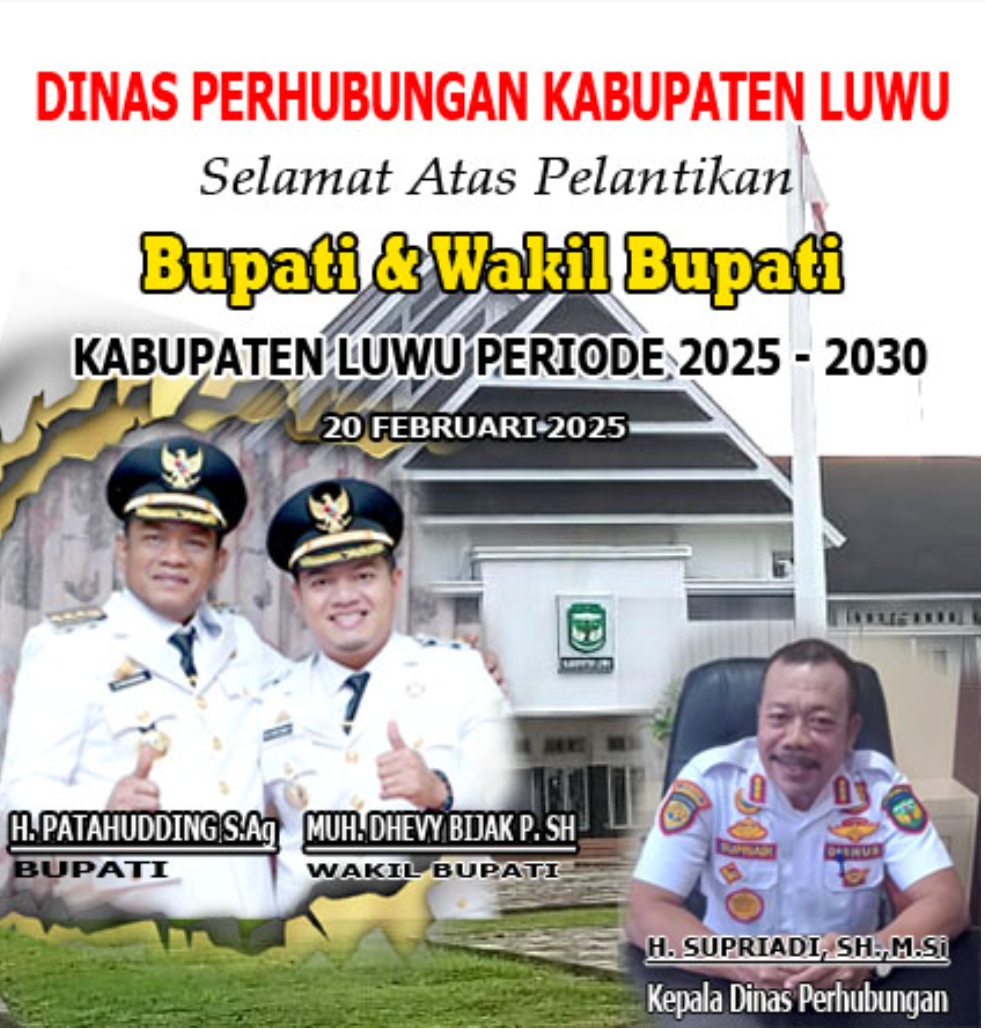 Kepala Dinas Perhubungan, H. Supriadi menyampaikan ucapan selamat yang sebesar-besarnya kepada Bupati dan Wakil Bupati Luwu yang baru saja dilantik, atas pelantikan dan dimulainya masa jabatannya untuk periode 2025-2030.