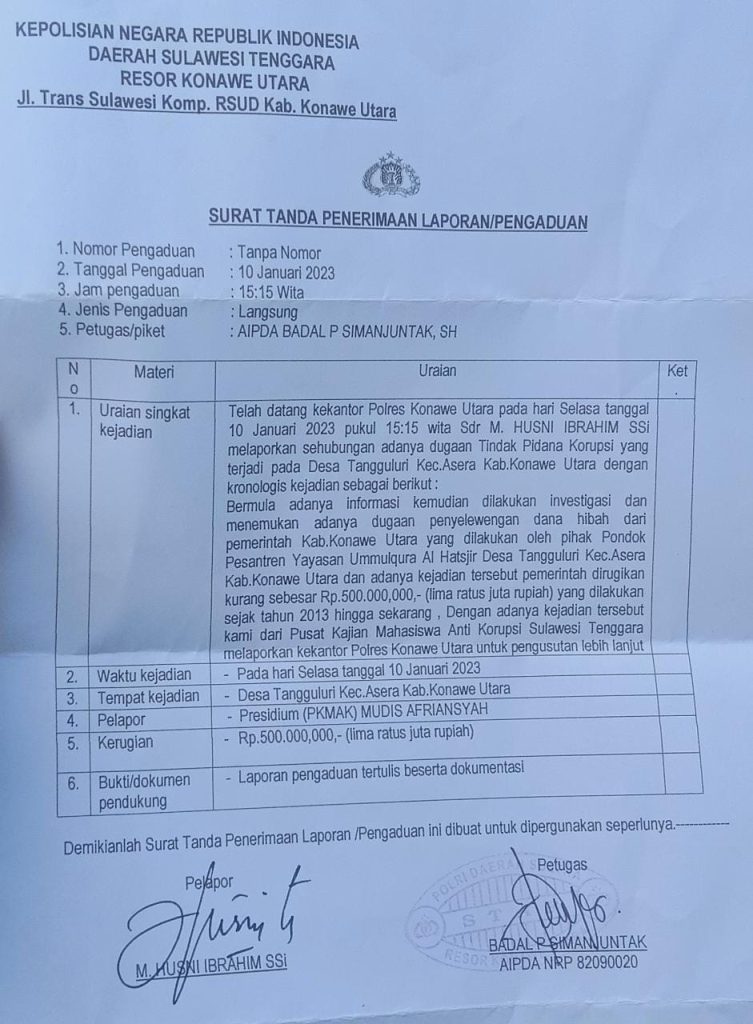 AA atas dugaan korupsi pembangunan Pondok Pesantren Yayasan Ummulqura Al Hatsjir ke Polres Konawe Utara.
