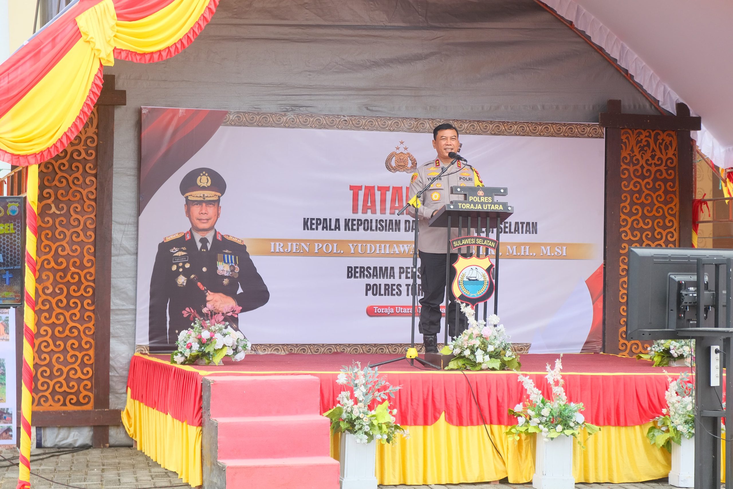 Kedatangan Irjen Pol. Yudhiawan disambut hangat oleh Kapolres Toraja Utara AKBP Zulanda, S.I.K., M.Si dengan prosesi pengalungan bunga dan jajar kehormatan. Acara ini juga dihadiri oleh Para Pejabat Utama (PJU) Polres Toraja Utara dan Forkopimda Kabupaten Toraja Utara.