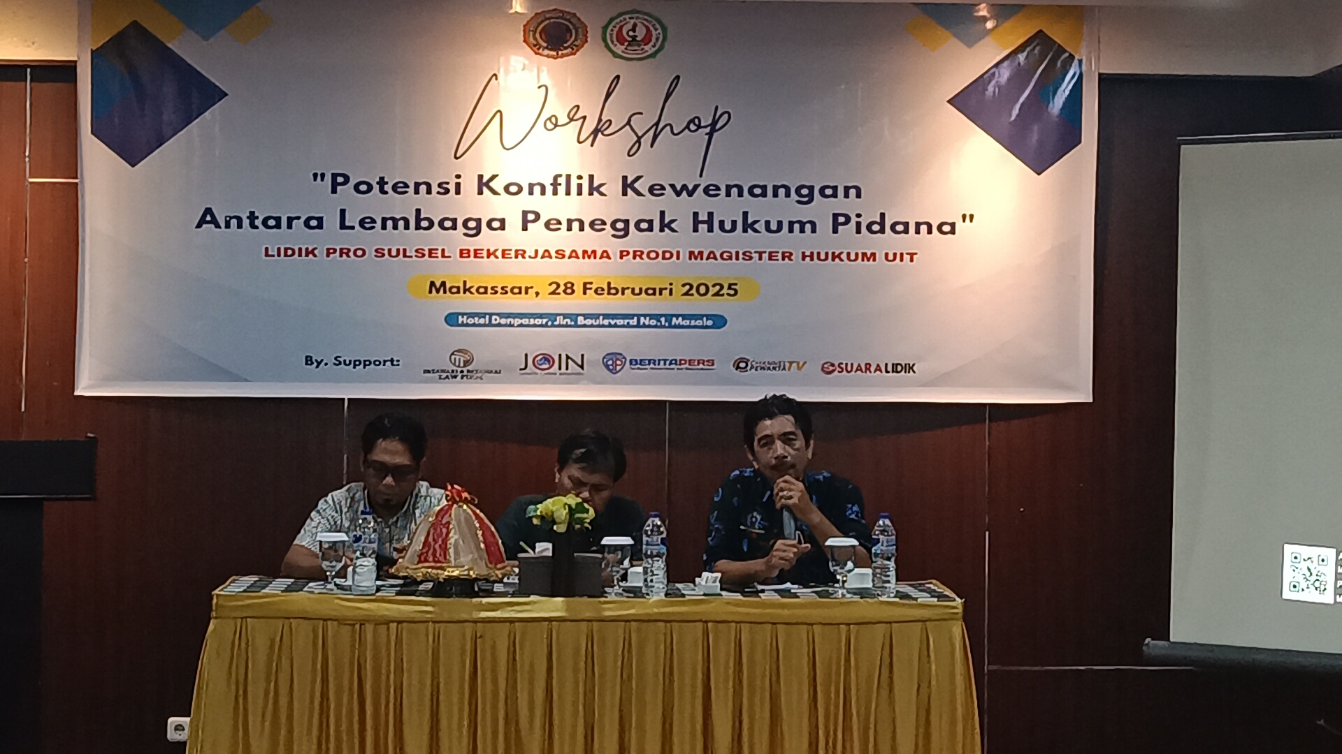 Fajarinfoonline.com,”Makassar – Lembaga Investigasi dan Kajian (LIDIK) PRO Sulawesi Selatan bekerja sama dengan Program Studi Magister Hukum Universitas Indonesia Timur (UIT) menggelar workshop bertajuk “Potensi Konflik Kewenangan Antara Lembaga Penegak Hukum”. Kegiatan ini membahas dampak Rancangan Undang-Undang (RUU) Kejaksaan, khususnya terkait pemberlakuan asas Dominus Litis, yang dinilai berpotensi menimbulkan konflik serta pelemahan terhadap institusi penegak hukum lainnya, terutama kepolisian.