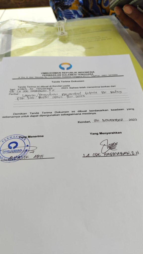 Yang menjadi pertanyaan besar saya saat ini sebagai pengaduan adalah sudah sampai dimana kelanjutan proses penanganan yang dilakukan oleh pihak ombudsman Republik Indonesia perwakilan provinsi Sulawesi tenggara terhadap kasus yang saya sebutkan di atas.?