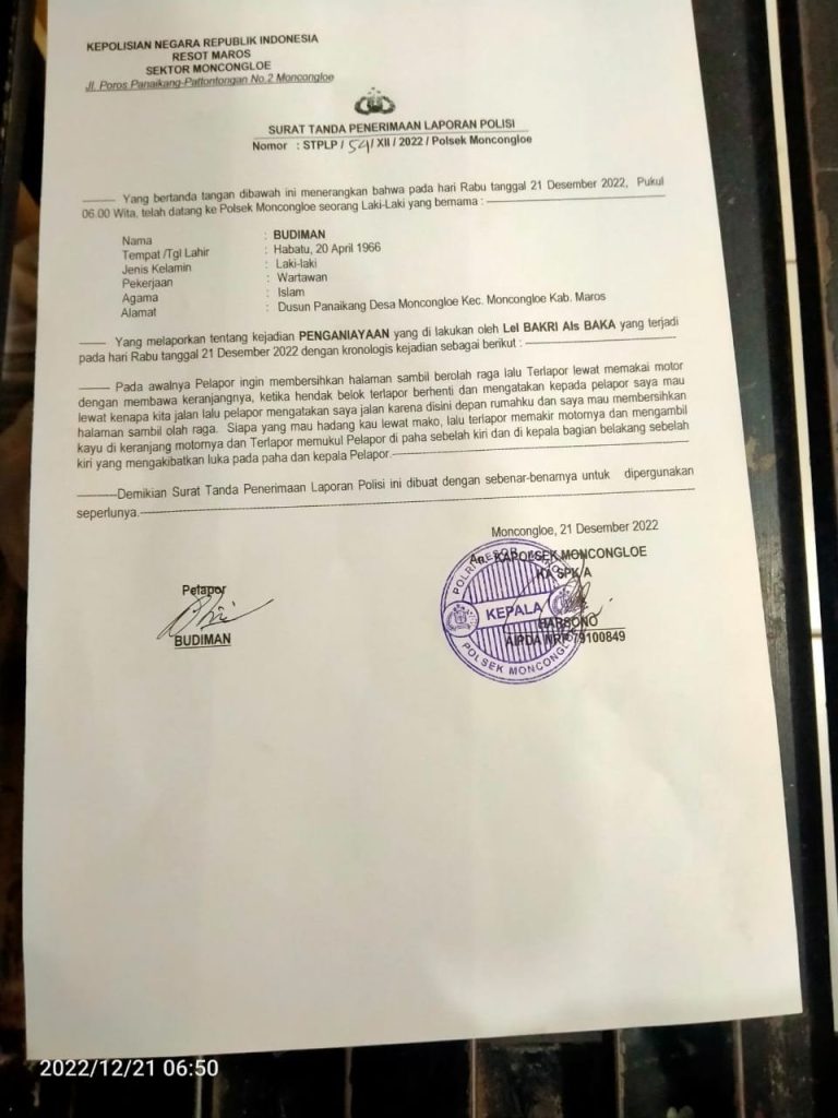 Fajarinfoonline.com,” Maros – Laporan kasus penganiayaan LP: 54/XII/2022/Polsek Moncongloe yang kini sudah berusia satu bulan lebih tak ada tanda-tanda keseriusan bagi aparat kepolisian polsek moncongloe untuk menangkap pelaku, Senin 23/01/2023.