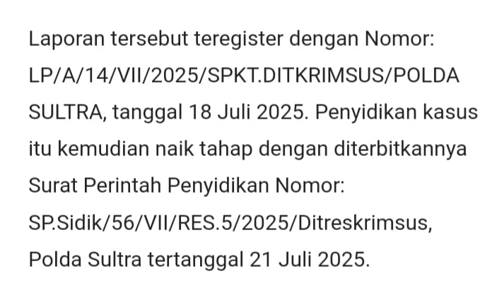 Berdasarkan dokumen yang ia peroleh, status penyidikan dimulai sejak 21 Juli 2025 dengan Nomor SP.Sidik/56/VII/RES.5/2025/Ditreskrimsus.