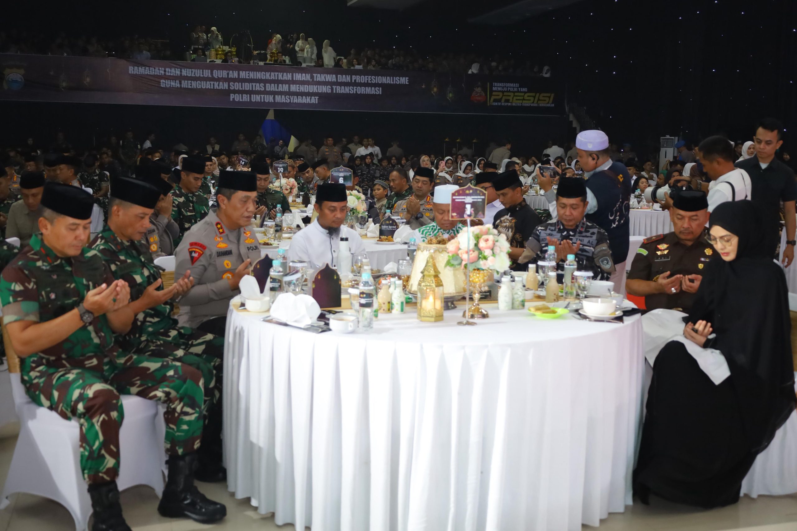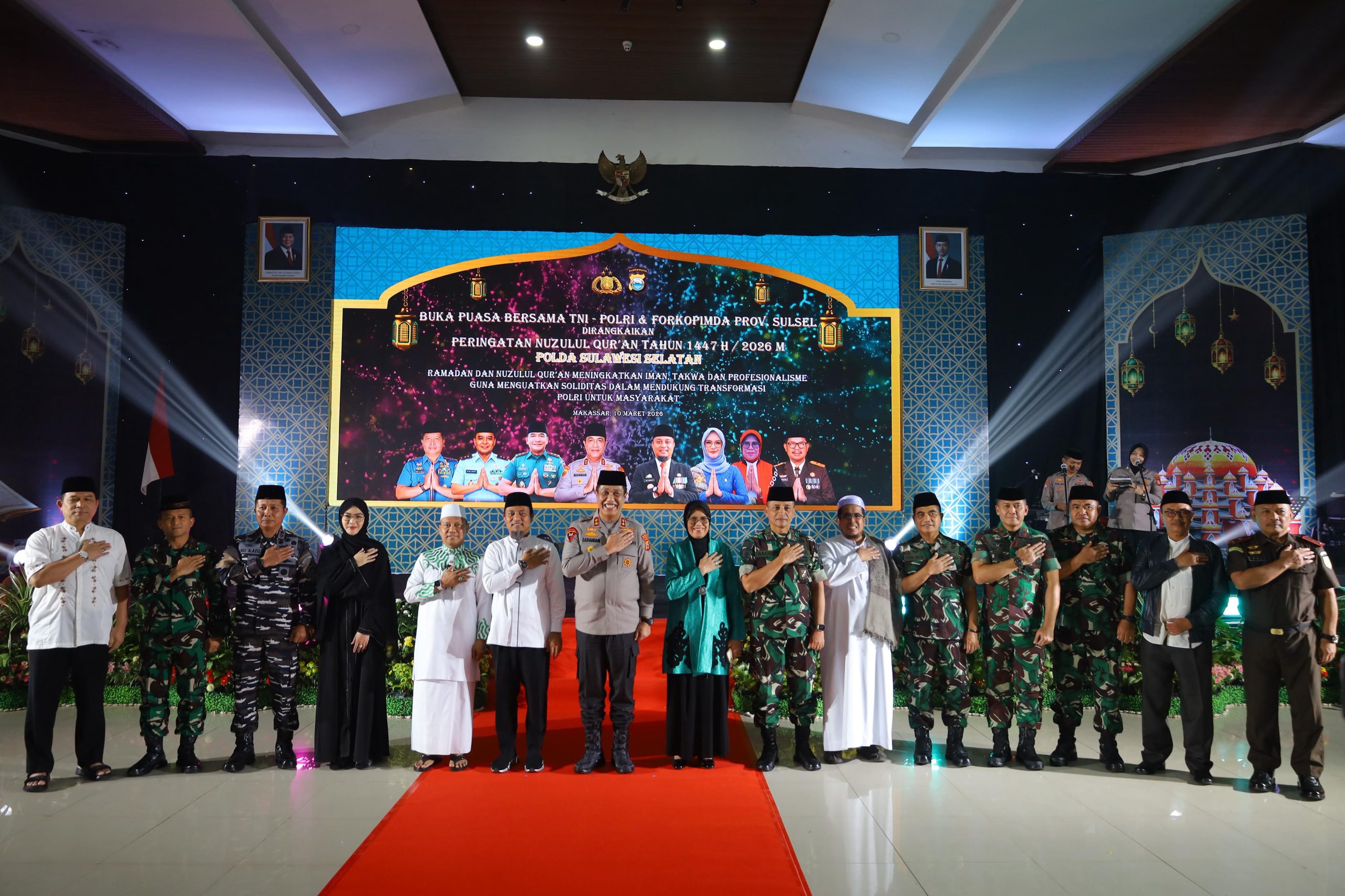Kepolisian Daerah Sulawesi Selatan (Polda Sulsel) menggelar kegiatan buka puasa bersama TNI-Polri dan Forum Koordinasi Pimpinan Daerah (Forkopimda) Sulawesi Selatan yang dirangkaikan dengan peringatan Nuzulul Qur’an 1447 H/2026 M. Kegiatan tersebut berlangsung di Aula Mappaoddang Mapolda Sulsel, Selasa (10/03/2026).