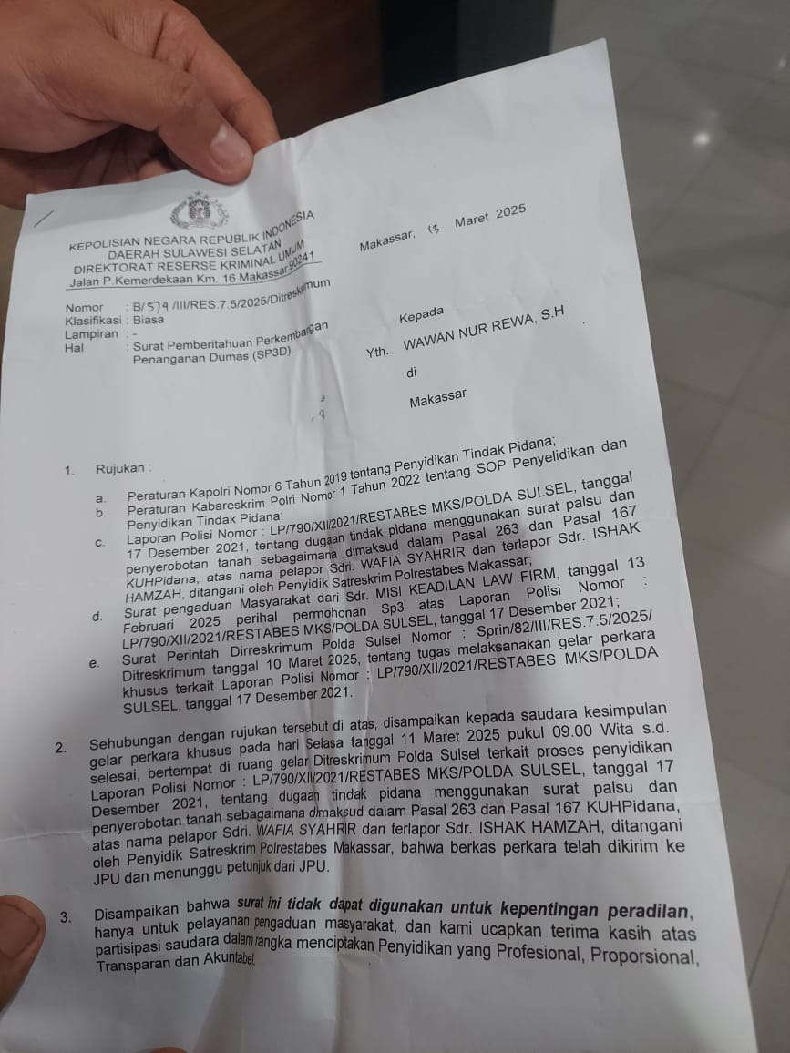 Fajarinfoonline.com,”Makassar – Pada tanggal 21 Maret 2025, Wawan Nur Rewang, S.H.,M.H, kuasa hukum Ishak Hamzah, terlapor dalam Laporan Polisi Nomor LP/790/XII/2021/RESTABES MKS/POLDA SULSEL, menggelar jumpa pers di Polda Sulsel (21/3/25). Laporan tersebut terkait kasus dugaan penyerobotan tanah yang telah berjalan selama kurang lebih empat tahun. Dalam jumpa pers tersebut, ia menduga adanya konspirasi besar-besaran dan obstruction of justice dalam penanganan kasus tersebut. Ia menyatakan kliennya telah mengalami ketidakpastian hukum dan hak asasi manusianya (HAM) terlanggar.