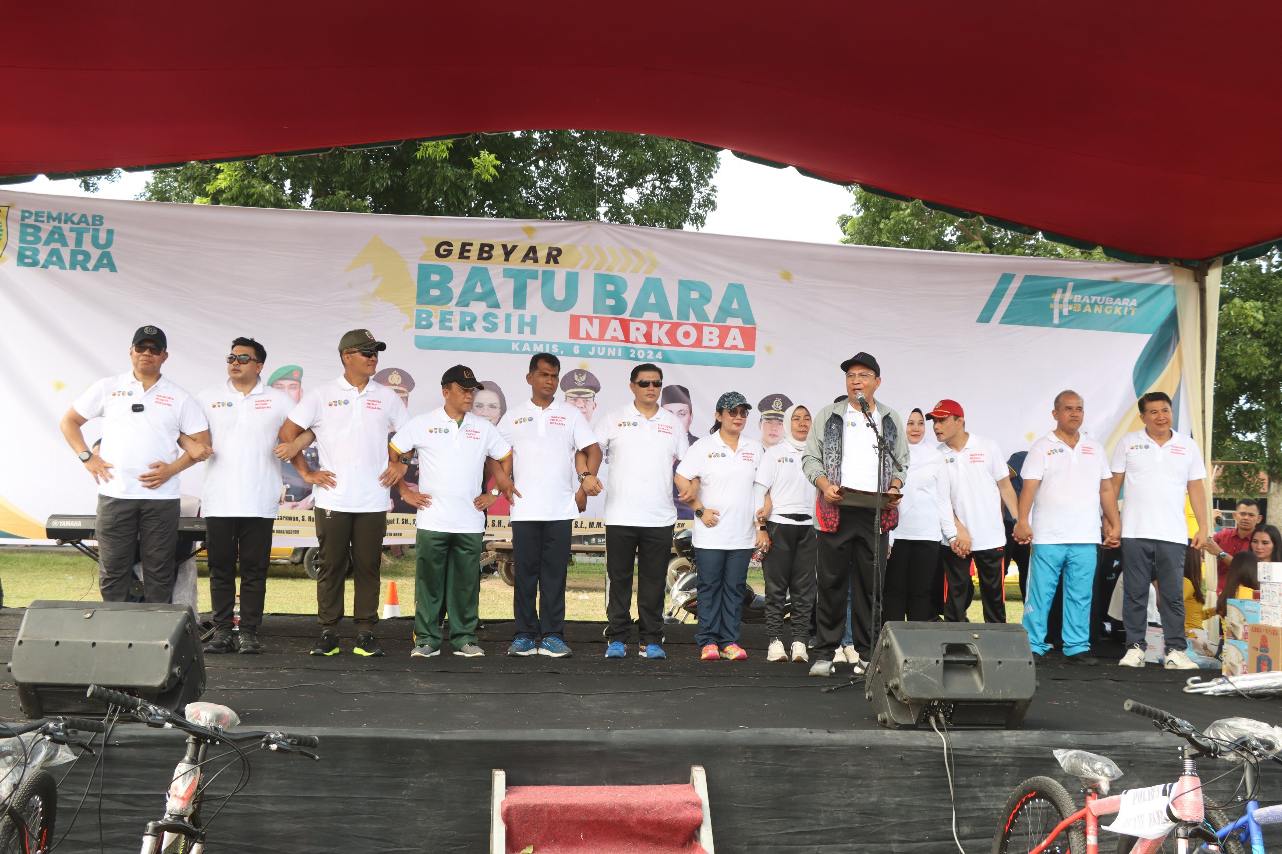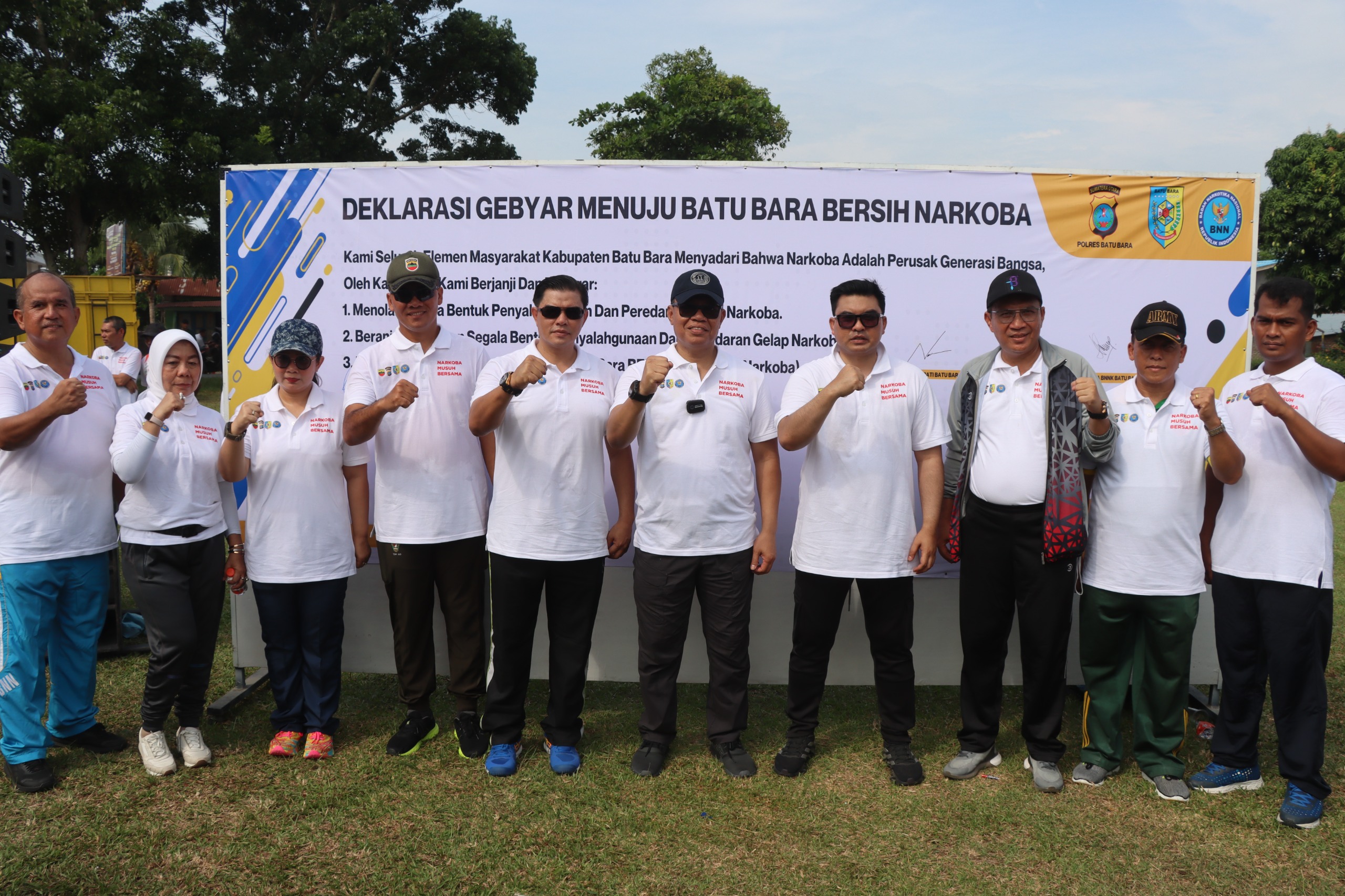 Fajarinfoonline.com, Batu Bara, Ribuan masyarakat bersama Forkopimda Batu Bara kompak mendeklarasikan perang dengan Narkoba pada acara Gebyar Batu Bara Bersih Narkoba. Kegiatan itu digelar di Lapangan Bola Kaki Blok 8, Kelurahan Lima Puluh, Kecamatan Lima Puluh, Kabupaten Batu Bara, pada Kamis (6/6/2024), sekitar pukul 07.00 wib.Kegiatan itu pun turut dihadiri oleh, Pj.Bupati Batu Bara, Nizhamul, Kapolres Batu Bara, AKBP Taufik Hidayat Thayeb, Kajari Batu Bara, Dicky Oktavia, Dandim 0208/AS, Letkol. Inf. M. Bassarewan, Danyon 126/KC, Kepala BNN Batu Bara, Kepala Pengadilan Negeri, Kasat Narkoba Polres Batu Bara, AKP Ferry Kusnadi, serta ribuan masyarakat.Setelah itu seluruh masyarakat yang hadir bersama dengan Forkopimda kompak mendeklarasikan perang dengan narkoba.”KAMI SELURUH ELEMEN MASYARAKAT KABUPATEN BATU BARA, MENYADARI BAHWA, NARKOBA ADALAH PERUSAK GENERASI BANGSA, OLEH KARENA ITU, KAMI BERJANJI DAN BERIKRAR:1. MENOLAK SEGALA BENTUK PENYALAHGUNAAN DAN PEREDARAN GELAP NARKOBA.2. BERANI MELAPORKAN SEGALA BENTUK PENYALAHGUNAAN DAN PEREDARAN GELAP NARKOBA.3. MEWUJUDKAN KABUPATEN BATU BARA BERSINAR (BERSIH NARKOBA).4. NARKOBA MUSUH KITA BERSAMA.Batu Bara Bangkit, Indonesia Bersinar,” teriak ribuan massa tersebut.Pada kesempatan itu juga, Pj. Bupati Batu Bara, Nizhamul mengungkapkan rasa bangganya kepada masyarakat karena bersedia untuk kompak menyatakan perang dengan narkoba. Maka dari itu ia pun mengungkapkan bahwa dirinya akan selalu siap untuk bergandengan tangan dengan Polres Batu Bara dalam pemberantasan narkoba.Kegiatan itu pun dibalut dengan acara jalan santai, senam bersama dan pengundian ratusan hadiah Lucky Draw , masyarakat sangat antusias dengan acara tersebut yg di hadiri lebih kurang 4000 orang dan acara selesai hingga jam 11.00 WIB *(Rizky Zulianda)*
