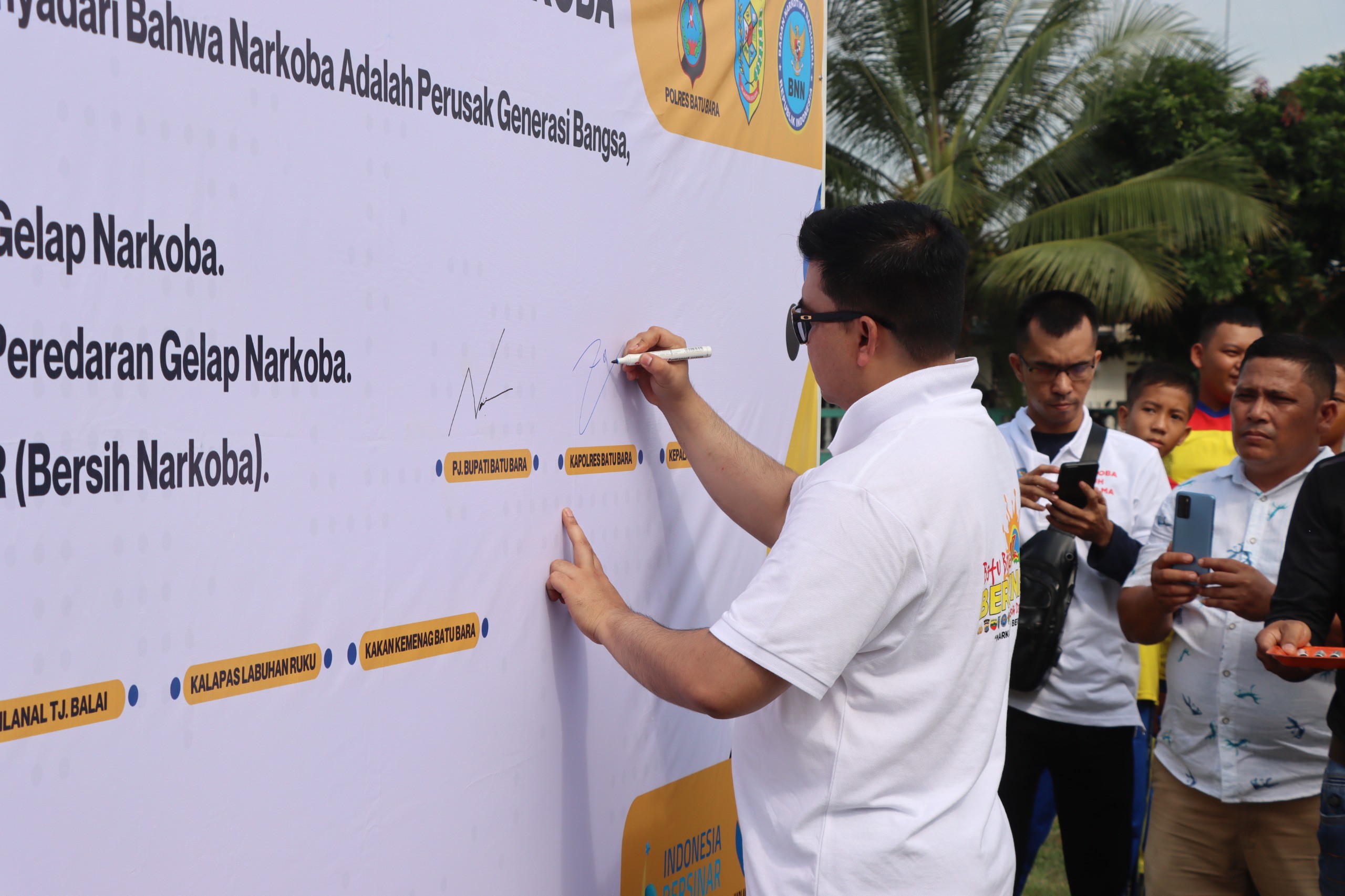 Indonesia mari kita berantas Narkoba.Selanjutnya berikrar menolak segala bentuk penyalahgunaan dan peredaran gelap narkoba. Yang ada di Kab Batu Bara.Kemudian berani melaporkan segala bentuk penyalahgunaan dan peredaran Narkoba. Mewujudkan Kabupaten Batu Bara Bersinar (bersih dari narkoba). Narkoba musuh kita bersama.Acara deklarasi gebyar menuju Batu Bara Bersih dari Narkoba mari kita Ikrar bersama Polres Batu Bara.Kegiatan tersebut dibalut dengan acara jalan santai , senam dan Lucky Draw berjalan dengan sangat antusias oleh masyarakat sekitar 4000 orang dan berjalan hingga jam 11.00 WIB *(RI-1)*