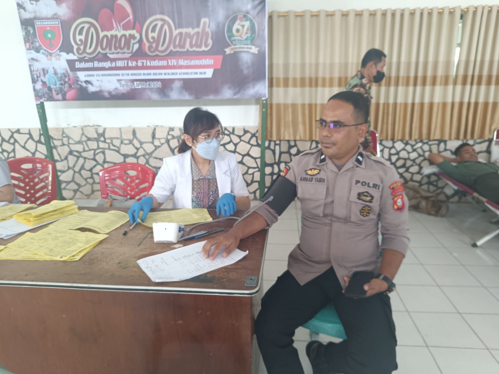 Polres Tana Toraja Berpartisipasi Ikut Aksi Donor Darah Peringati HUT Ke – 67 Kodam XIV/Hsn Tahun 2024