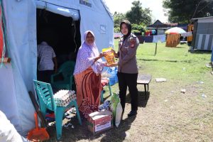 Senyum bahagia tak dapat ditutupi dari wajah korban kebakaran saat melihat rombongan polwan mendatangi tempat pengungsian sementara yang didiran dilapangan bola Kelurahan Ela Ela,