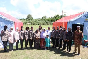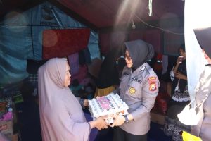 Senyum bahagia tak dapat ditutupi dari wajah korban kebakaran saat melihat rombongan polwan mendatangi tempat pengungsian sementara yang didiran dilapangan bola Kelurahan Ela Ela,