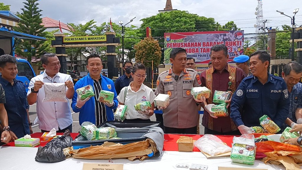 Pemusnahan Barang Bukti Narkoba Tahun 2023 dilaksanakan di Lapangan mapolres Polrestabes Makassar dan di pimpin langsung oleh Kapolrestabes Makassar Kombes Pol Budhi Haryanto