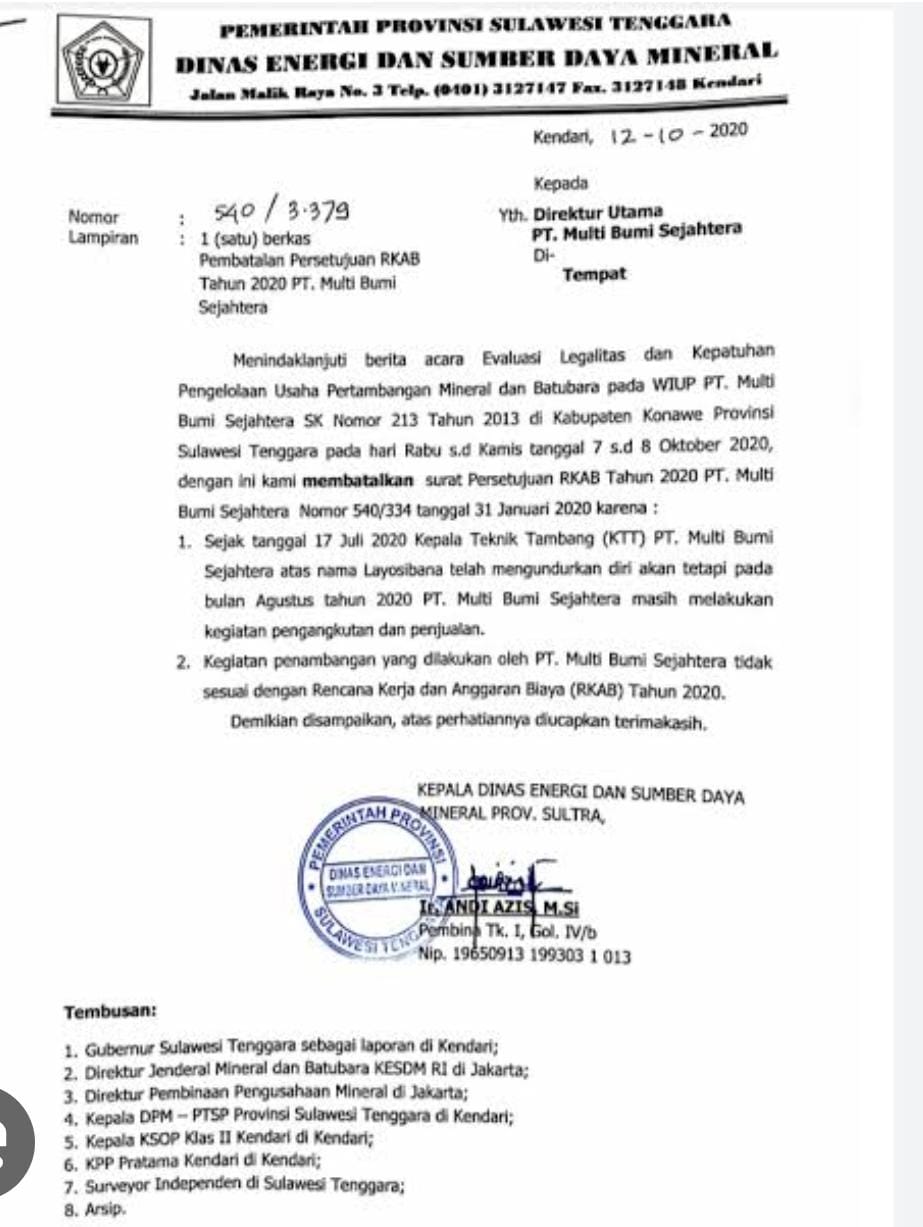 Budi Yuwono selaku pelapor atas kerugian ore nikel sebanyak (80.000) delapan puluh ribu MT saat dikonfirmasi via telepon mengatakan “RKAB PT.MBS telah dicabut pada tanggal 12 Oktober 2020 namun PT.MBS masih tetap melakukan penjualan hingga Januari 2021 “jelas Budi Sabtu (18/10/2025).