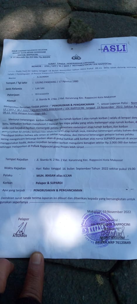 Menurut Suhardi, Kejadian itu sudah lama. Tepatnya bulan November 2022 dan sudah ada pelaporan ke Polsek rappocini namun hingga saat ini tahun 2023 belum ada kejelasan pelakunya masih berkeliaran.