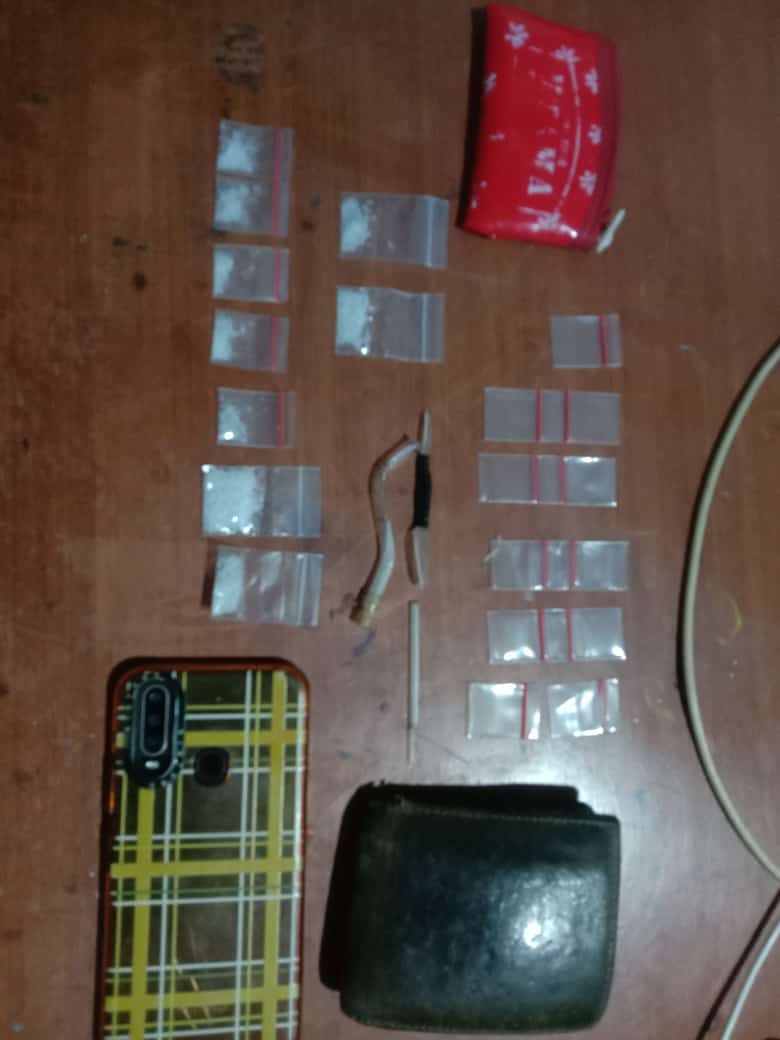 Lanjut AKP Suardi bahwa saat dilakukan penggeledahan terhadap terduga pelaku, pada saku jaket yang digunakan terduga pelaku ditemukan sebuah tas/dompet yang berisikan 9 shacet bening yang diduga sabu, 1 batang kaca pirex dan 1 batang sendok sabu.