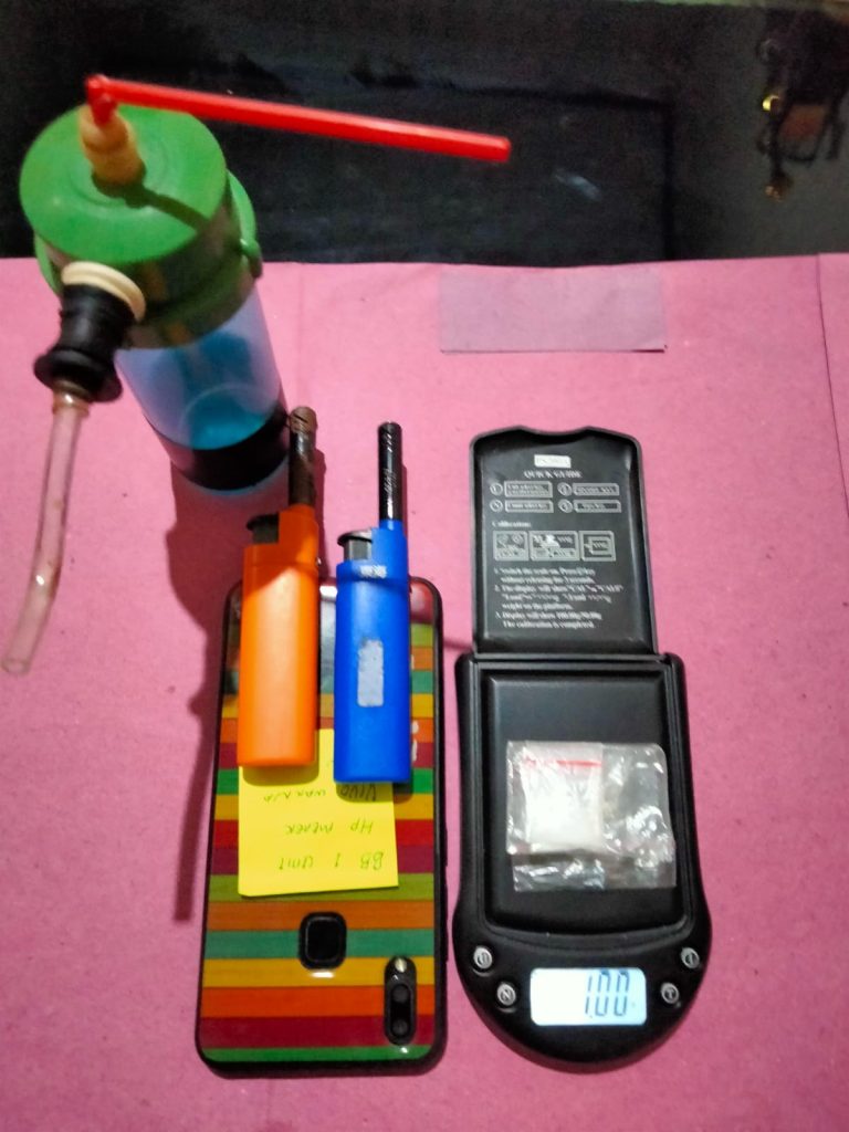 Selain barang bukti yang diduga sabu, polisi juga menemukan satu buah bong alat isap sabu, dua buah korek api, satu buah sendok sabu dan satu buah Handphone Merek Vivo warna biru hitam .