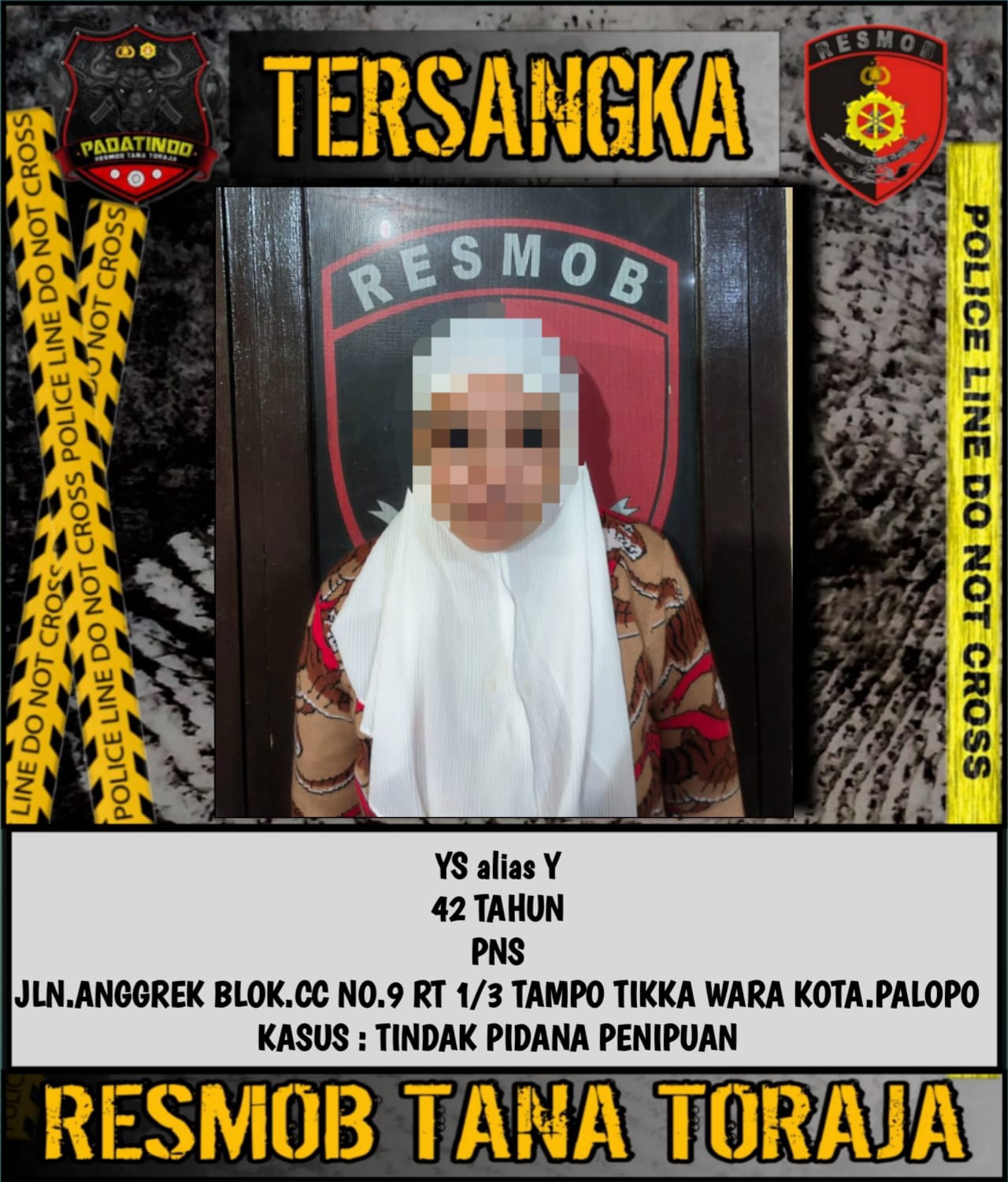 Kapolres Tana Toraja melalui Kasat Reskrim AKP S. Ahmad membenarkan bahwa benar telah diamankan seorang perempuan yang diduga telah melakukan penipuan adapun inisialnya yaitu YS (45) pekerjaan Pegawai Negeri Sipil (PNS) beralamatkan Kota Palopo