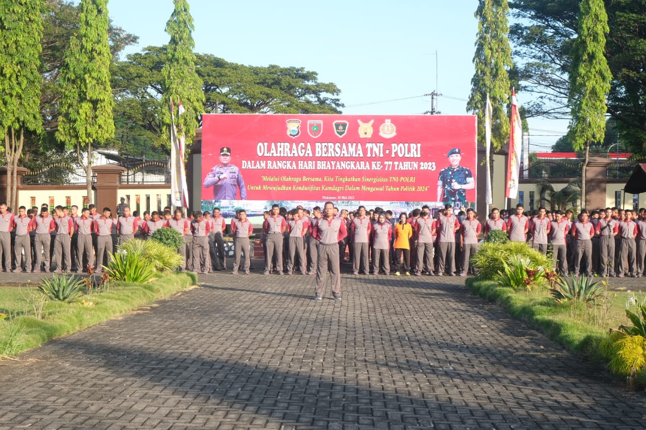 Fajarinfoonline.com,”Gerak jalan santai TNI bersama Polri memperingati hari bhayangkara ke – 77 digelar Polda Sulsel, Selasa (30/05/2023).