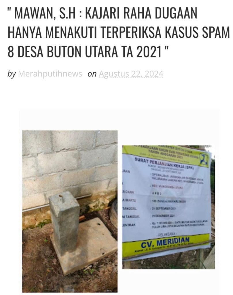 Fajarinfoonline.com,’Butur- Masih menindaklanjuti terkait kasus dugaan penyalahgunaan anggaran pekerjaan sarana penyediaan air minum atau SPAM delapan (8) desa di kabupaten Buton Utara yang tidak bisa di manfaatkan oleh masyarakat setempat dan menghabiskan anggaran sebesar Rp. 4.745.000.000, 00. Untuk diketahui, proyek SPAM tahun anggaran 2021 itu tersebar di delapan desa di Butur. Yakni Desa Bubu Kecamatan Kambowa, Desa Lahumoko Kecamatan Kambowa, Desa Oengkapala Kecamatan Wakorumba Utara, kelurahan labuan kecamatan wakorumba Utara, Desa Kotawo Kecamatan Kulisusu Barat, Desa Koepisino Kecamatan Bonegunu, Desa Karya Bakti Kecamatan Kulisusu Barat, Desa Oensumala Kecamatan Bonegunu dan Desa Dampala Jaya Kecamatan Kulisusu Barat. Dan yang paling parah adalah pekerjaan sarana penyediaan air minum atau SPAM kelurahan labuan karena dugaan mangkrak dan menghabiskan anggaran sebesar Rp. 1. 185. 800. 000., sudah hampir puluhan kali penyidik pidana khusus (PIDSUS) Kejaksaan negeri Raha turun kelapangan mengecek kondisi SPAM kelurahan labuan kecamatan wakorumba Utara tersebut akan tetapi tidak ada kepastian hukum sudah sampai dimana kelanjutan kasusnya, ataukan penyidik kejaksaan negeri Raha hanya sebatas dugaan menaku – nakuti saja terperiksa, Wallahu alam hanya tuhan maha segalanya yang tahu. Saya sebagai pelapor dalam kasus SPAM delapan(8) desa di kabupaten Buton Utara tahun anggaran (TA) menantang kepala kejaksaan negeri Raha untuk secepatnya menaikan status ke penyidikan (publikasi penetapan tersangka), agar publik dan masyarakat percaya sepenuhnya pada kinerja kejaksaan negeri Raha. Dan kejaksaan negeri Raha harus secepatnya melakukan pemanggilan terhadap oknum-oknum terkait pekerjaan sarana penyediaan air minum atau SPAM delapan (8) desa tahun anggaran 2021 di kabupaten Buton Utara diantaranya sebagai berikut :