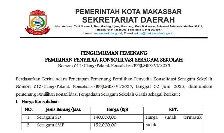 Dan Berdasarkan Berita Acara Penetapan Pemenang Pemilihan Penyedia Konsolidasi Seragam Sekolah Nomor: 010/Ulang/Pokmil. Konsolidasi/BPBJ.MKS/VI/2025, tanggal 30 Juni 2025, diumumkan pemenang Pemilihan Konsolidasi Pengadaan Seragam Sekolah Gratis. Ditemukan 31 pemenang dengan rincian anggarannya.