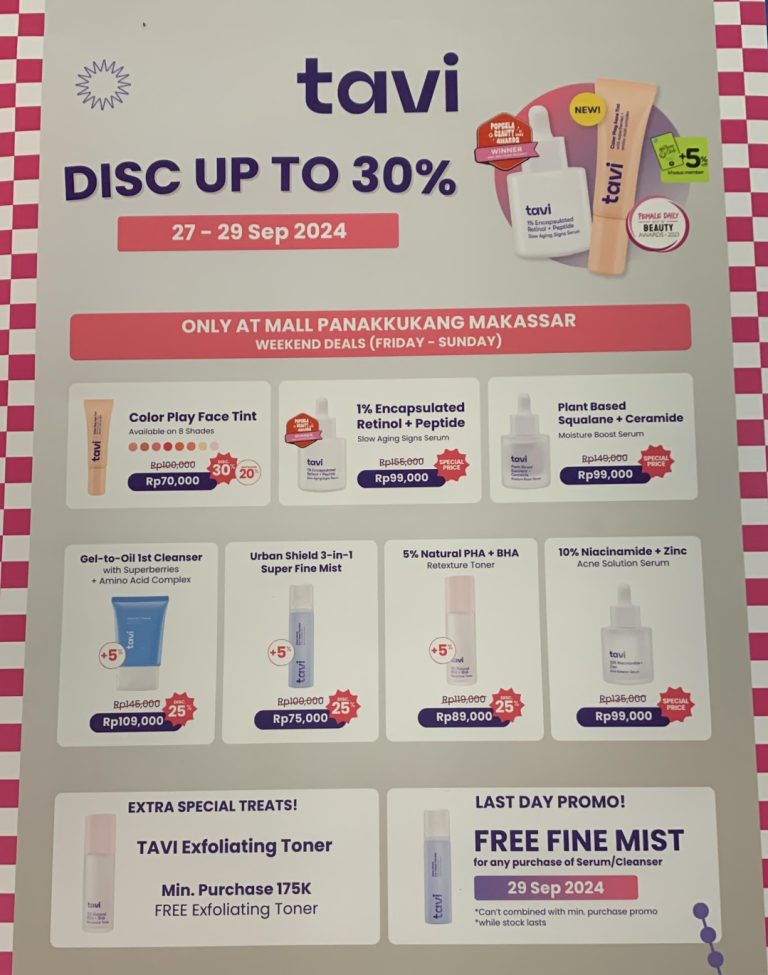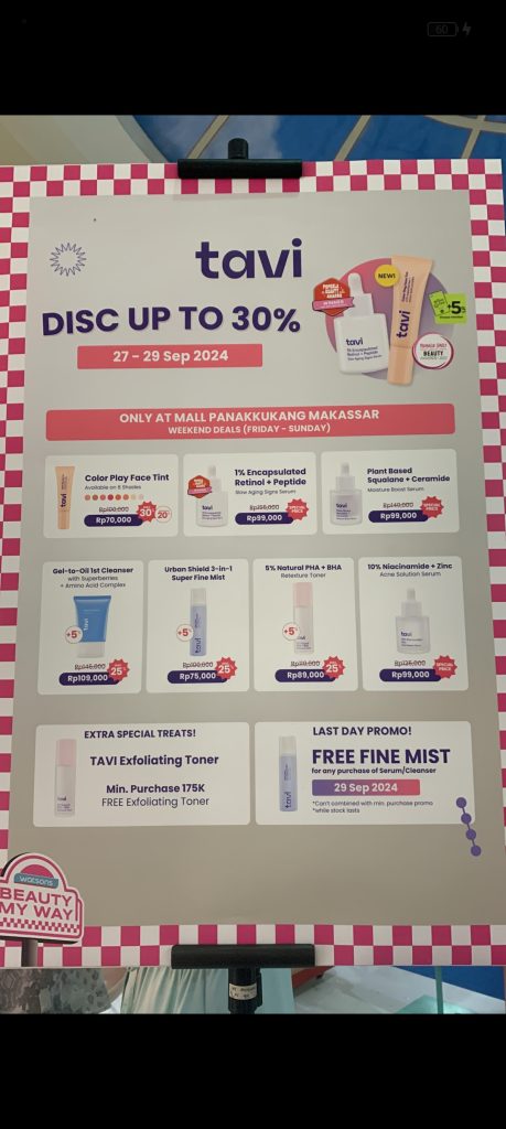 Tavi hadir di beauty my way dengan promo menarik yaitu up to 30% dan banyak hadiah menarik. Selama periode 23 September – 29 September 2024, beauty enthusiast bisa mengunjungi Watsons Beauty My Way di Atrium Mall panakukkang untuk mendapatkan seluruh penawaran dengan promo diskon.