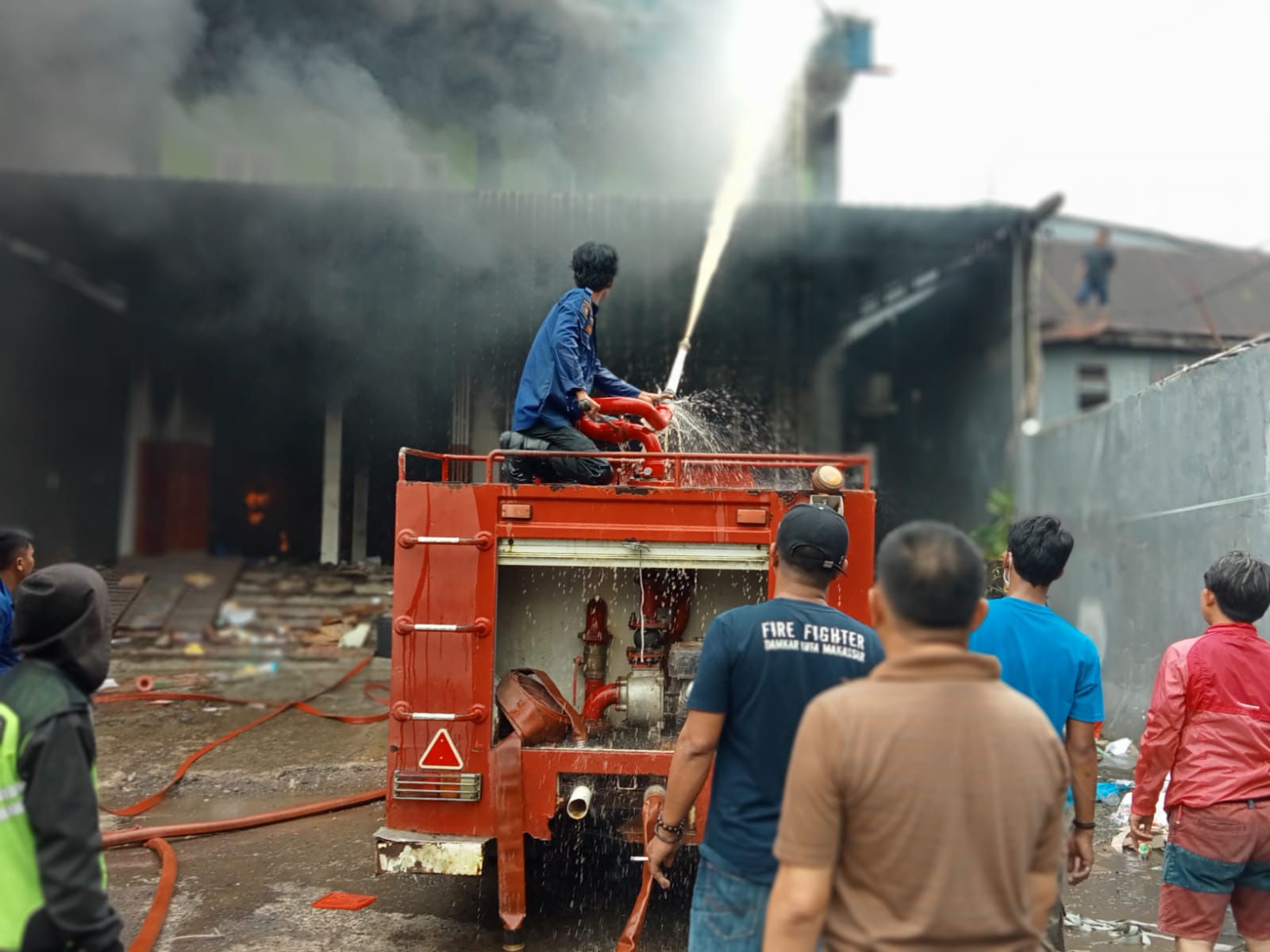 Hingga kini pihak kami masih melakukan proses pemadaman dilokasi TKP . Tim kami mengalami kesulitan untuk masuk kegudang melakukan pemadaman disebabkan kobaran api yang terlanjur membesar ,bahkan kami meminta bantuan dari pihak Damkar Makassar , sebab kendala yang dialami masuk kedalam gudang TKP untuk memadamkan kobaran api tidak ada , dan hingga kini kami belum tahu penyebabnya. Jelasnya.