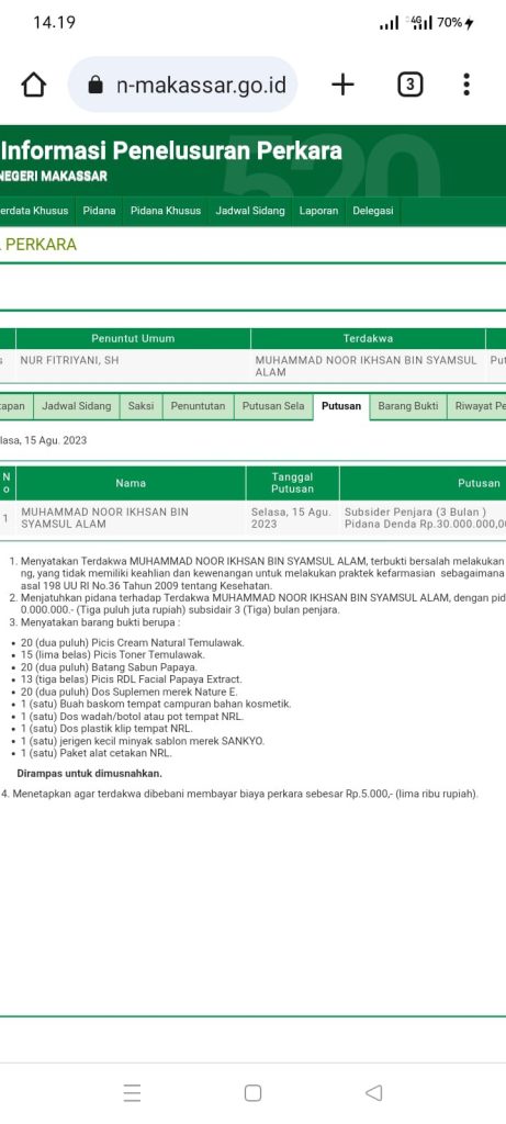 “Perbuatan terdakwa MNI dalam meracik sendiri Kosmetik, terdakwa juga tidak memiliki keahlian dan kewenangang merupakan Perbuatan yang melanggar Pasal 196 dan Pasal 198 UU Nomor 36 Tahun 2009 Tentang Kesehatan,” terang Ahli IRDA Rezkina dikutip dari laman SIPPN Makassar.
